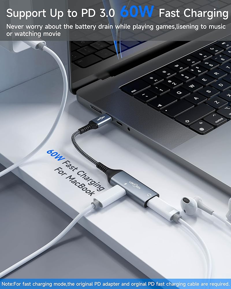 🎧 【يدعم الشحن السريع PD 60 واط 】يدعم جهاز الصوت والشاحن المقسم USB c الشحن السريع PD حتى 60 واط (20 فولت 3 أمبير). بنيت في شريحة قوية للحفاظ على استقرار جهد الشحن والتيار وحماية أجهزتك. ملحوظة: قد لا يدعم مراقبة الجودة لبعض الهواتف الجديدة. نقترح استخدام شاحن حائط PD للحصول على سرعة شحن أسرع.
