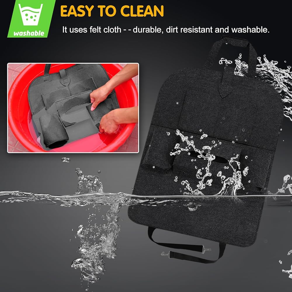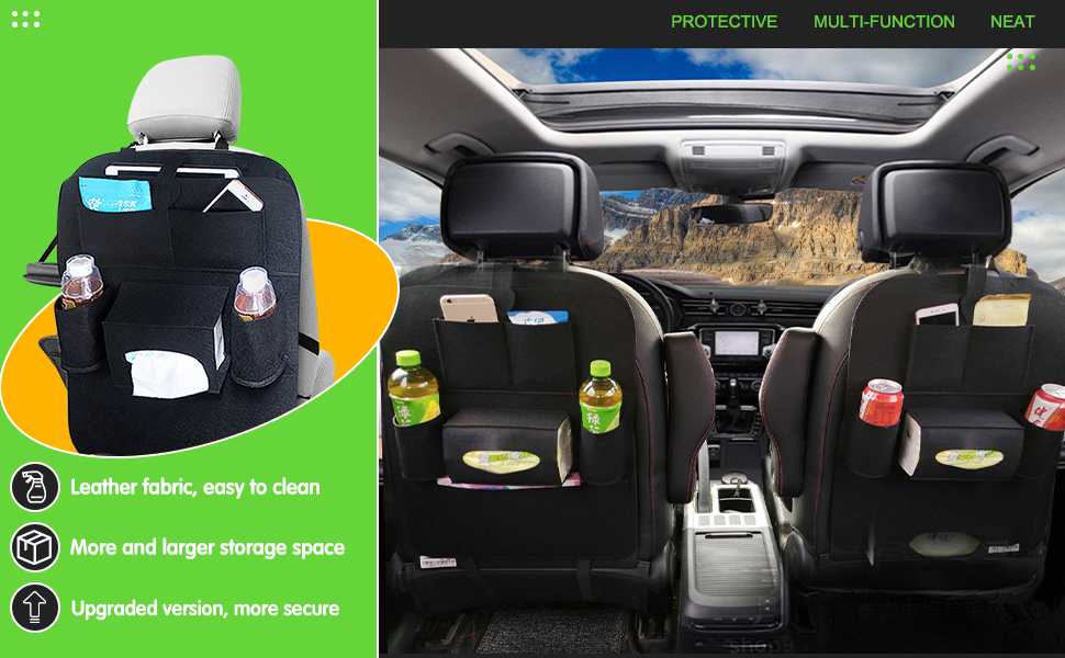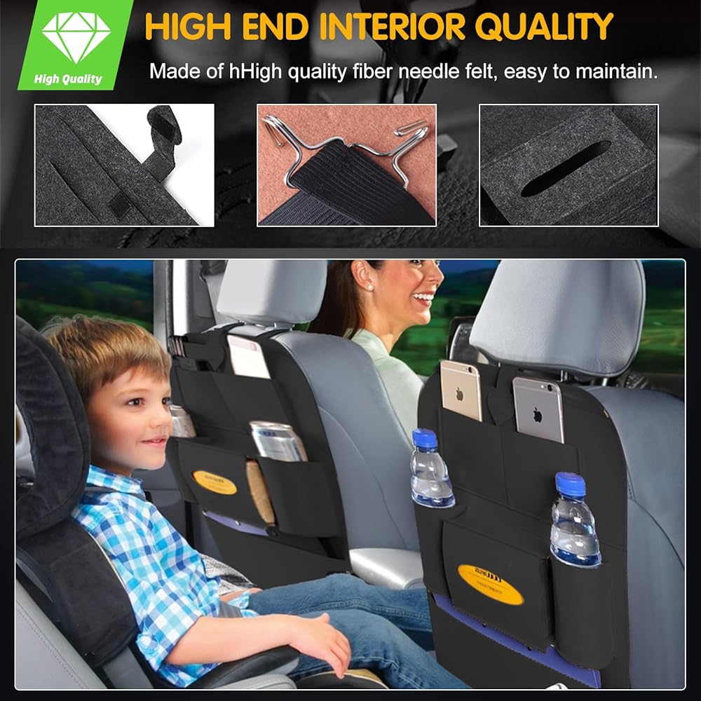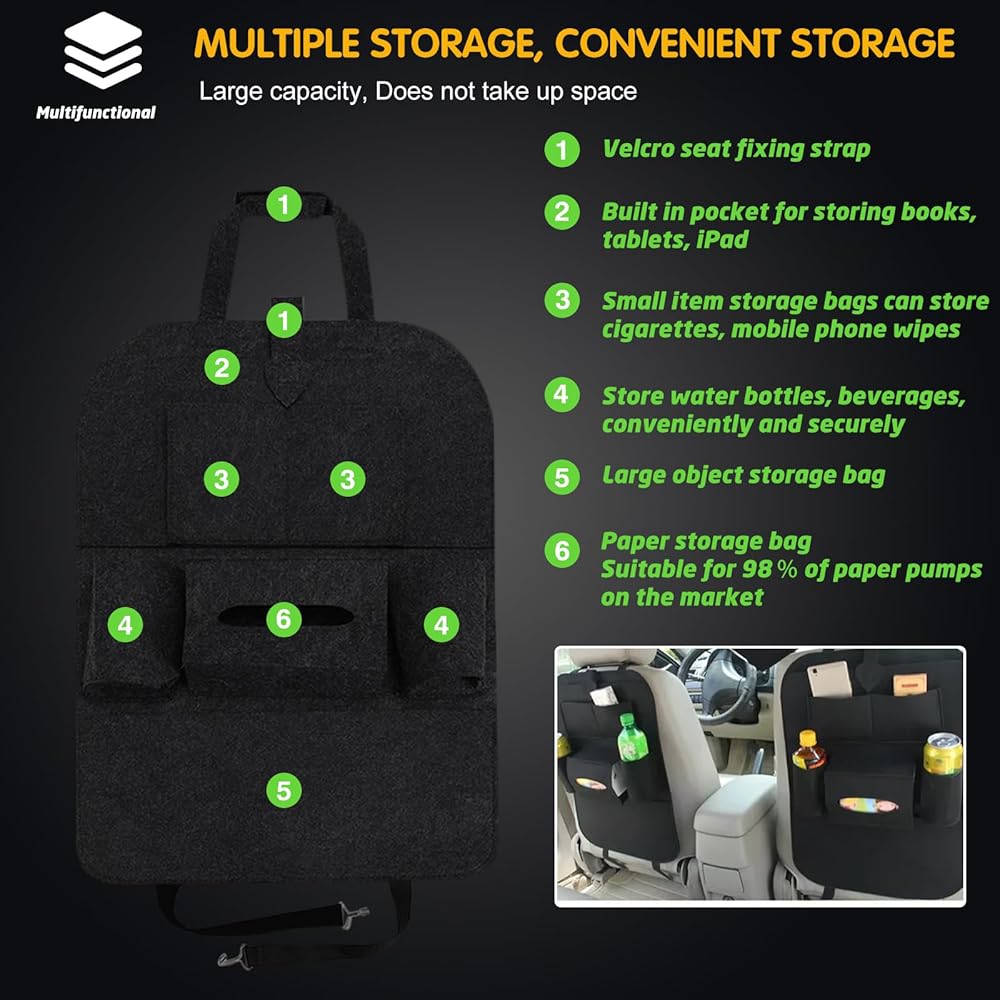 متعدد الاستخدامات ومتعدد الوظائف: منظم السيارة الخلفي هذا ليس للتخزين فقط؛ كما أنه يمكن استخدامه كواقي للمقعد، مما يحافظ على مقاعدك نظيفة وآمنة من الانسكابات والبقع والكشوط. إنه الإكسسوار المثالي لأي مالك سيارة يبحث عن الراحة والتنظيم أثناء التنقل.