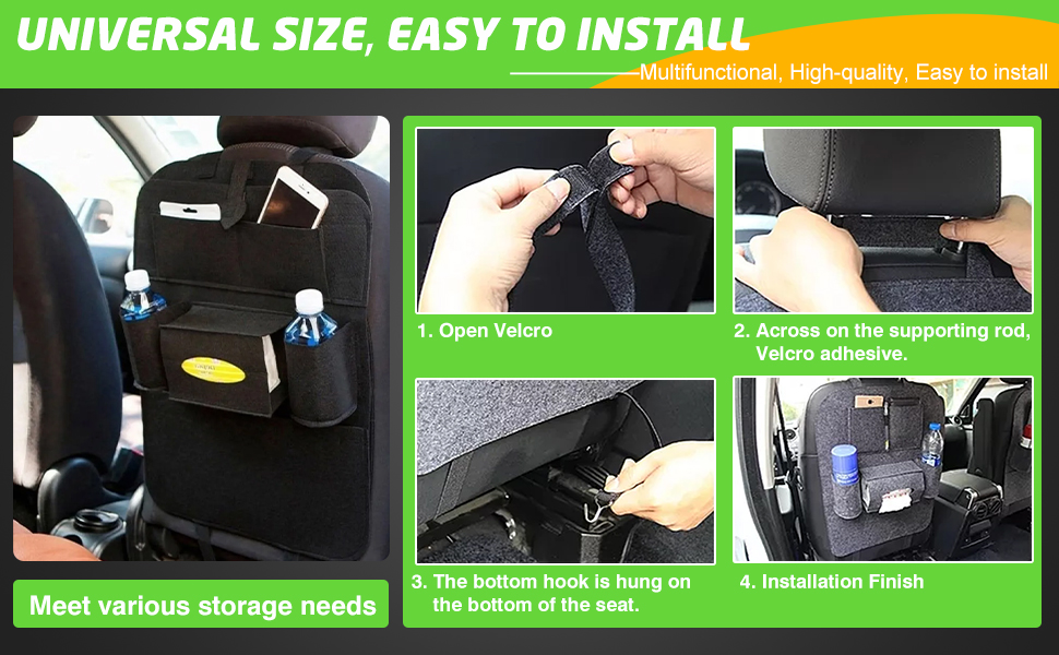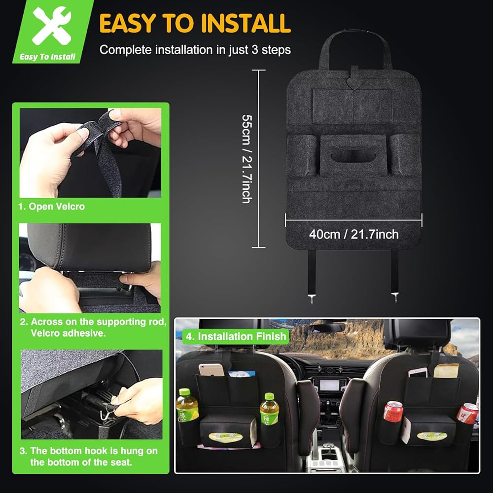 تركيب سريع وسهل: مع حزام مسند الرأس بإبزيم وإبزيم سفلي، يمكن تركيب منظم السيارة هذا في أقل من دقيقة، مما يوفر الوقت والجهد.