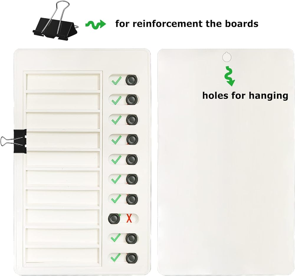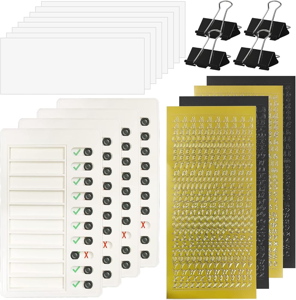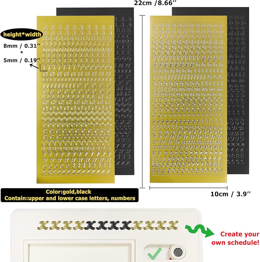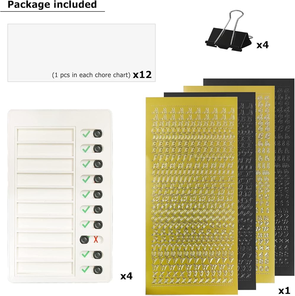 تتضمن العبوة - تتضمن العبوة 4 قطع من المخططات الروتينية، و12 قطعة من بطاقات DIY الفارغة، و4 قطع من ملصقات الحروف، و4 قطع من المشابك السوداء لمنع الشبكات من السقوط. مع فتحة في الخلف، يمكن تعليقها على الحائط أو الباب أو أي مكان آخر.