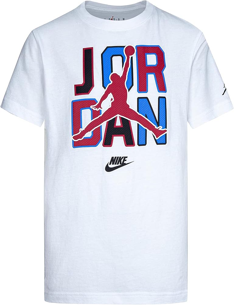 A bold tee for your energetic enthusiasts, the Jordan Kids DNA Tee brings both comfort and style to their look. Designed with a classic ribbed crew neck and a relaxed silhouette, this tee offers a versatile and easy-to-style option. Whether they prefer a casual or a more polished style, this tee adapts to their fashion sense. Standard fit. Signature logo on the front and the left arm. Nike logo below the graphics. Short sleeves. Pullover style. 100% cotton. Machine washable. Imported.