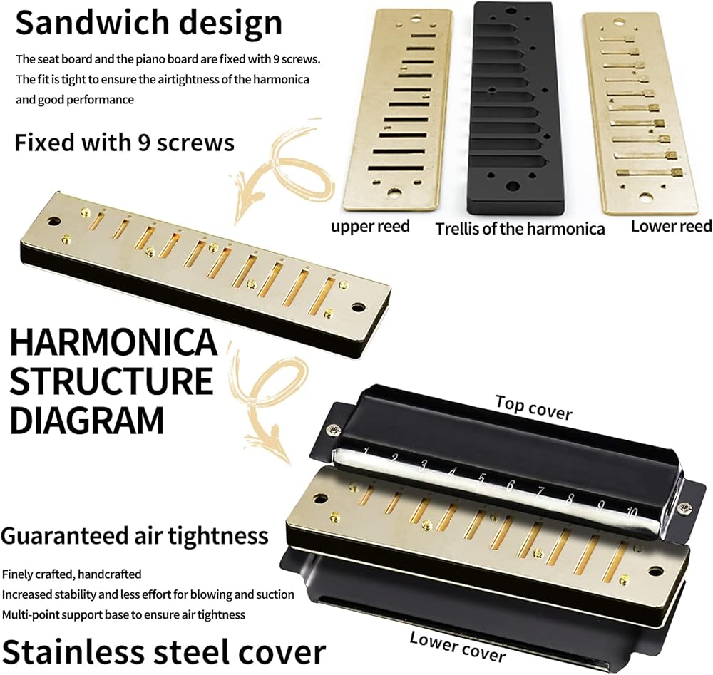 【مواد عالية الجودة】الهارمونيكا مصنوعة من لوح غطاء سميك من الفولاذ المقاوم للصدأ، وهو أكثر صلابة ولا يتشوه بسهولة وله رنين ثابت. أمشاط ABS غير السامة الموجودة في جهاز الفم هذا آمنة وعديمة الرائحة، وبعد صقلها يدويًا، تصبح ناعمة وتضفي لمسة أفضل.