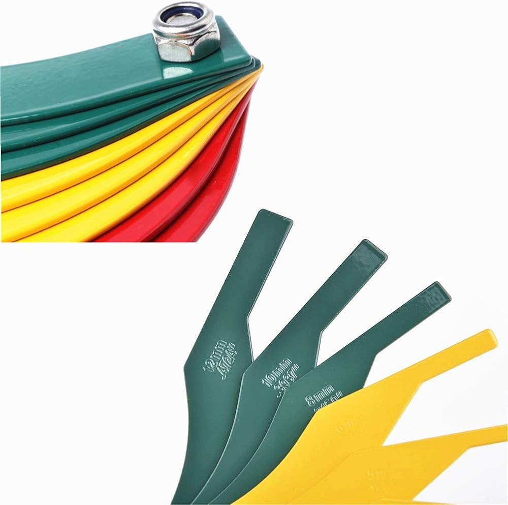 • متري وSAE: متري - 8، 10، و12 ملم (أخضر)، 4، 5، 6 ملم (أصفر)، 2 و3 ملم (أحمر). SAE - 0.3150 إلى 0.4720 بوصة (أخضر)، 0.1575 إلى 0.2382 بوصة (أصفر)، 0.0787 إلى 0.1181 بوصة (أحمر)