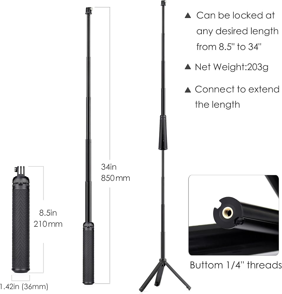 3) The extension pole can be locked at any desired length from 8.5 to 28 inch. The standard 1/4 inch screw on the bottom can be connected to extend the length.
