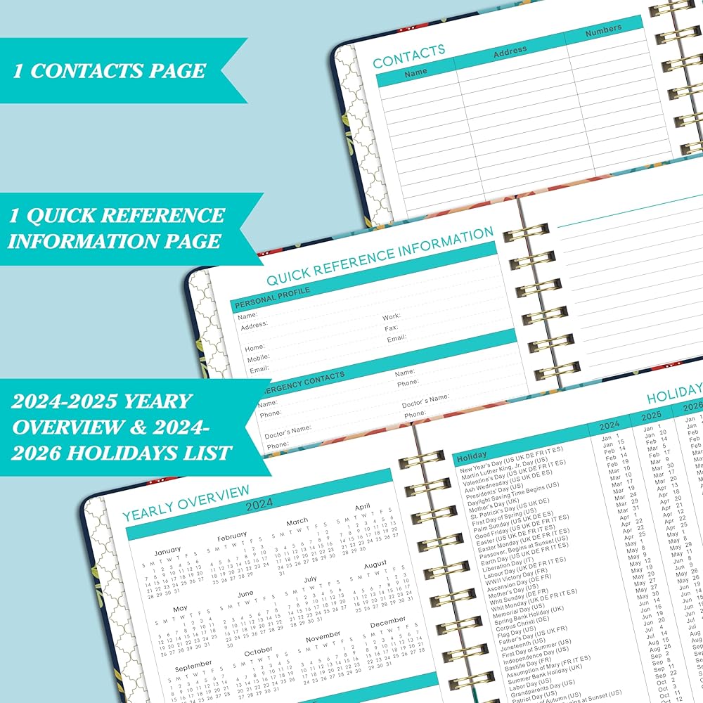 • ☀ تنظيم مميز - نظرة عامة سنوية 2024-2025/قائمة عطلات 2024-2026/1 صفحة معلومات مرجعية سريعة/1 صفحة جهات الاتصال/جيب داخلي/ربط بسلك مزدوج/شريط مطاطي/غطاء صلب/12 علامة تبويب شهرية.