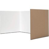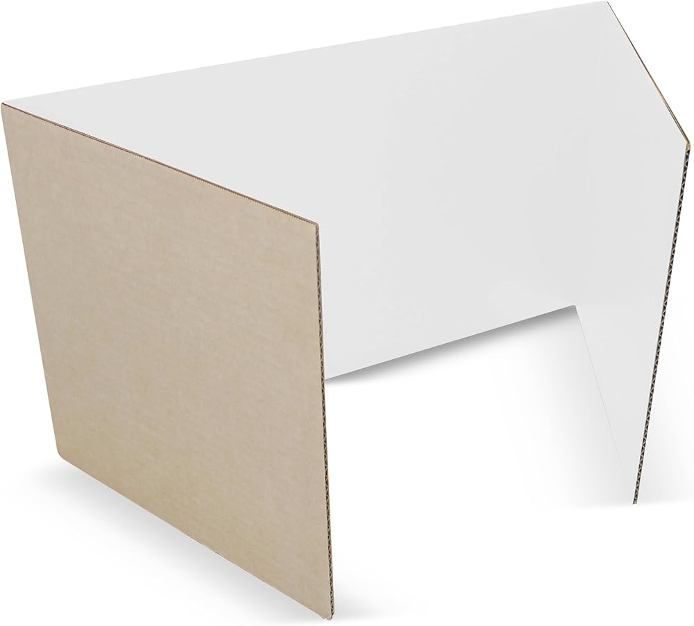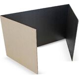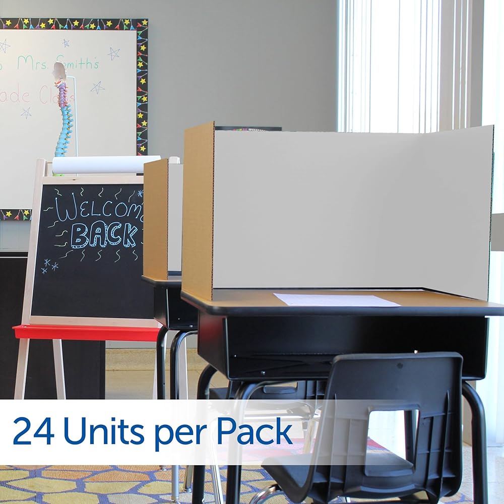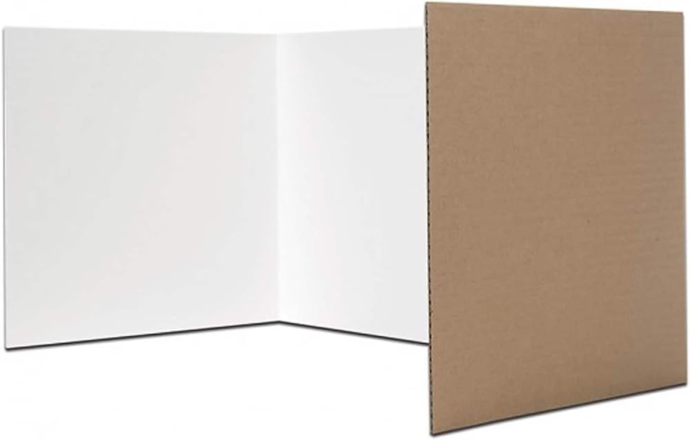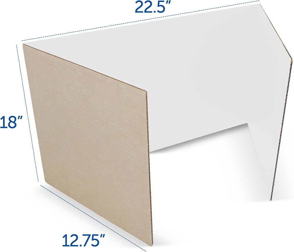 An economical solution for providing partitions in the classroom and using them as desk dividers. Keep students focused and curb wandering eyes with trifold corrugated study carrels. Ideal for instant testing centers or private study areas to eliminate distractions. Sturdy construction with clean lines and side panels that fold flat for storage when not in use. Ideal for reinforcing distancing within the classroom. Privacy folder boards measure 18"H x 48"W. Side panels measure 18"H x 12.75"W. Center panel measures 18"H x 22.5"W. Pack of 24.