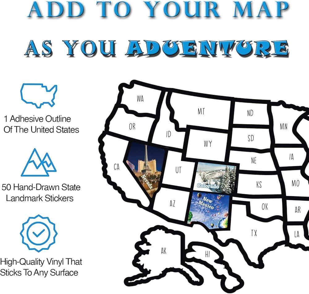 • ✓ تتبع رحلتك - هل حان الوقت لمعرفة مساحة الأرض التي تغطيها عبر الولايات المتحدة؟ ستعرض خريطة الولايات المتحدة الخاصة بنا مع الرسوم التوضيحية الأصلية مغامراتك بكل فخر. مجموعة الملصقات هذه رائعة للأطفال والكبار على حد سواء لتتبع سفرك وإظهار المكان الذي قمت بزيارته. يمكنك أيضًا إظهار تقدمك أمام زملائك المسافرين من الخارج أو داخل منزلك المتنقل، أو العربة، أو عربة سكن متنقلة، أو مقطورة السفر، أو السيارة، أو الشاحنة، أو سيارات الدفع الرباعي.