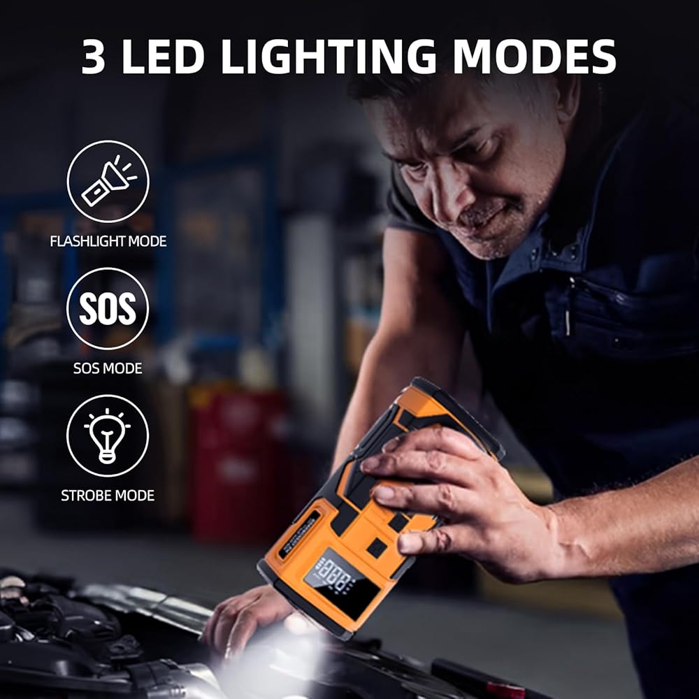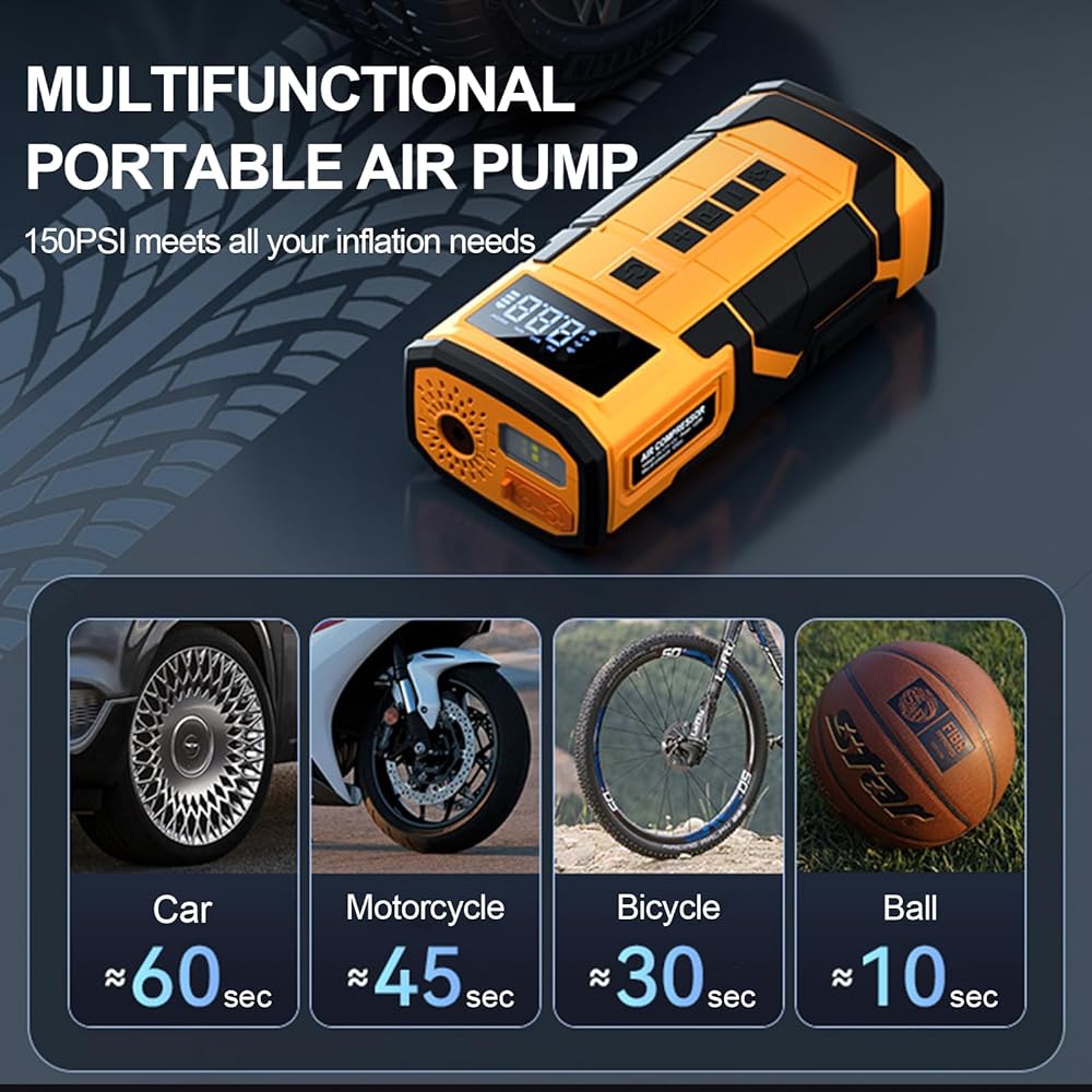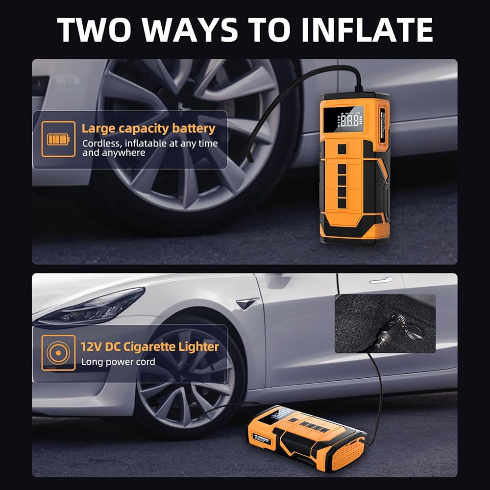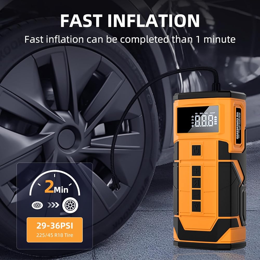 شاشة LCD وإيقاف تلقائي: تأتي مضخة نفخ الإطارات هذه مع مقياس ضغط وشاشة رقمية LED، مما يتيح لك قراءة ضغط الإطارات في الوقت الحقيقي والإعداد المسبق بسهولة. علاوة على ذلك، يمكنك ضبط ضغط الإطارات بسهولة وبمجرد الوصول إلى الضغط المطلوب، سيتم إيقاف تشغيل ضاغط الهواء المحمول منفاخ الإطارات Model X تلقائيًا.