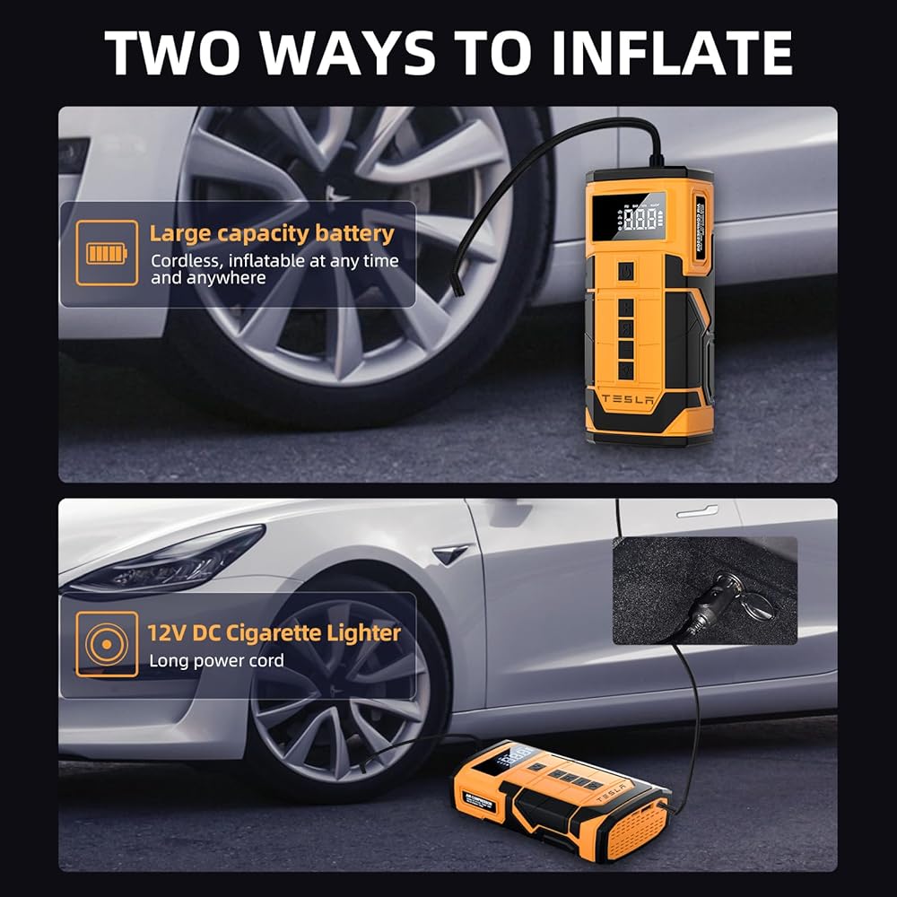 وضع إمداد الطاقة المزدوج: تأتي مضخة الهواء Tesla Model Y مع وضعين لإمداد الطاقة، بما في ذلك البطاريات القابلة لإعادة الشحن للاستخدام اللاسلكي وسلك طاقة 12 فولت تيار مستمر. يمكن استخدام مضخة الهواء هذه لاسلكيًا في حالات الطوارئ الخاصة بالإنقاذ على الطرق، كما تستخدم سلك الطاقة للشحن خاصة للبطارية المنخفضة. يعد منفاخ إطارات السيارة المحمول من تيسلا خيارًا ممتازًا لنفخ أي شيء وفي أي مكان تحتاجه.