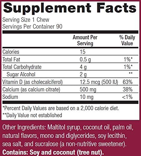 نسبة عالية من الكالسيوم وفيتامين د3: توفر كل مضغة 500 ملغ من الكالسيوم على شكل سترات الكالسيوم، و500 وحدة دولية من فيتامين د3 لتعزيز امتصاص الكالسيوم*