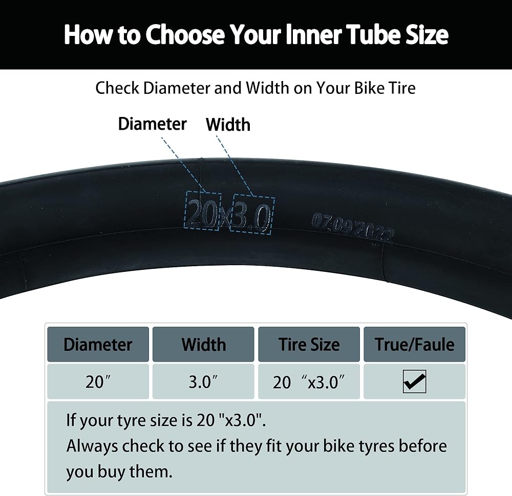 【تعليمات التثبيت】يرجى التحقق من جانب الإطار الخاص بك لمعرفة حجم الأنبوب الداخلي الذي تستخدمه دراجتك عند الشراء، فهي أنابيب الإطارات الدهنية مقاس 20 × 3.0.