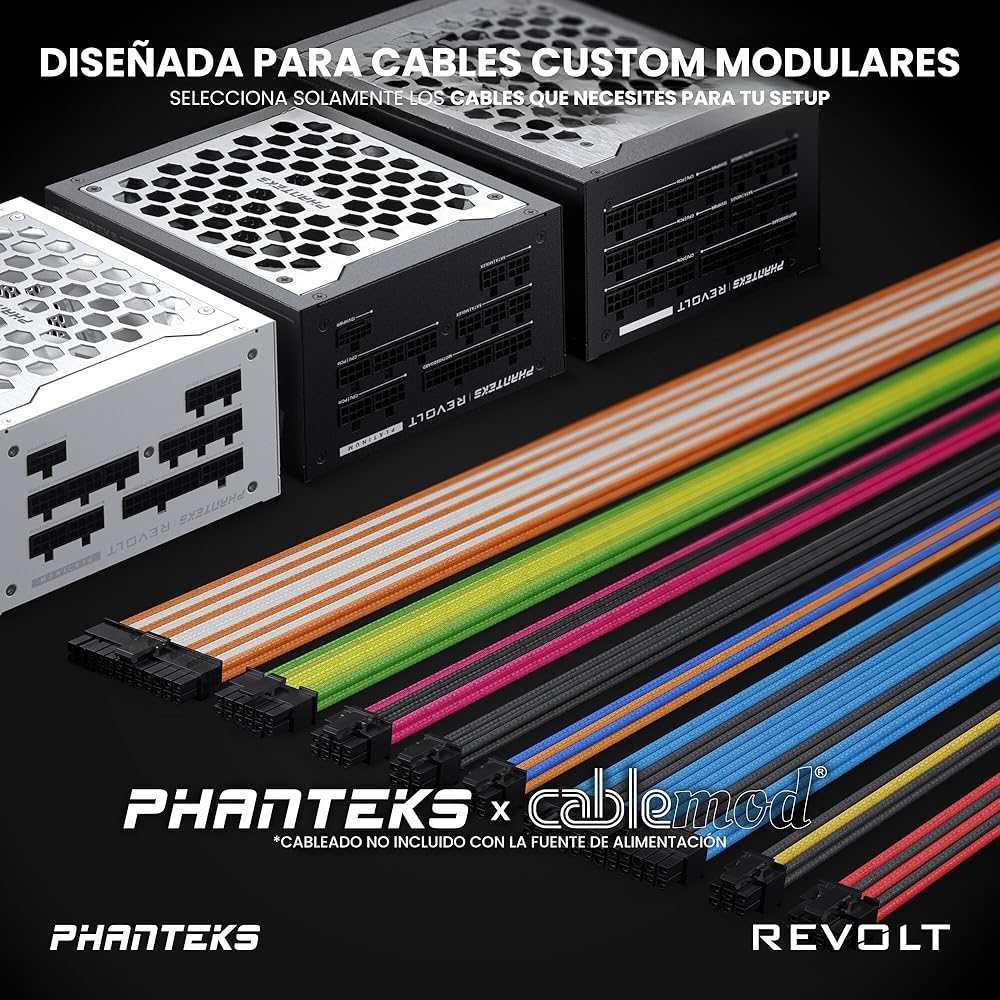 Phanteks will offer a power supply without cables for users who want custom cables from CableMod. The new Revolt power supplies give you complete control to choose which power supply and which cables you need, saving needless cables in the process. The Revolt power supplies from Phanteks have been developed with Seasonic to ensure the highest standards of performance and reliability. All models fully support and exceed the latest Intel ATX 3.0 specifications and with 80 Plus Platinum. Type: Power Supply DC output 1200W 80+ Platinum. Color: Black. Cooling Fan: 135mm Fluid Dynamic Bearing (FDB) Fan. Output Protection: OPP (Overpower Protection), OVP (Over Voltage Protection), UVP (Under voltage protection, SCP (Short Circuit Protection), OCP (Over Current Protection), OTP (Over Temperature Protection), No-Load Protection, Reset Protection. Back Plate: Fully Modular. PSU Output Connector: 1x 18+10pin => Motherboard, 5x 8pin => CPU / PCIe, 5x 6pin => SATA / Molex, 1x 12VHPWR => PCIe. Output Voltage 12V / Maximum Current 100A / Max Capacity 1200W. Output Voltage 5V / Maximum Current 25A / Max Capacity 125W. Output Voltage 3.3V / Maximum Current 25A / Max Capacity 125W. Output Voltage -12V / Maximum Current 0.3A / Max Capacity 3.6W. Output Voltage 5VSB / Maximum Current 3A / Max Capacity 15W. DC Output: 1200W. AC Input: 100-240Vac 15-7.5A 50-60Hz. 16-Pin PCI-e Gen5 Capacity: 600W. Operating Temp.: 0 to 50 degree Celsisu (The rated power will derate from 100% to 80% from 40 degree Celsius to 50 degree Celsius linearly). Operating Humidity: To 85% relative humidity (non-condensing). Storage Temperature: -40 to 85 degree Celsius. Storage Humidity: To 95% relative humidity (non-condensing). MTBF: Over 100,000 hours at 25 degree Celsius excluding the DC Fan. PSU Dimension (LxWxH): 160 mm x 150 mm x 86 mm (6.3 in x 5.9 in x 3.4 in). Net Weight: 2.26 kg / 4.98 lbs. Scope of Delivery: 1x PH-P1200PR_WT01C Power Supply, 1x C14 (female) - C13 (male) Power cord (1500mm), Accessory: 1x User's manual, 1x Installation guide, 1x PSU bag, 1x Zip tie bag, 1x Screw pack, 1x Velcro pack , 1x PSU tester.