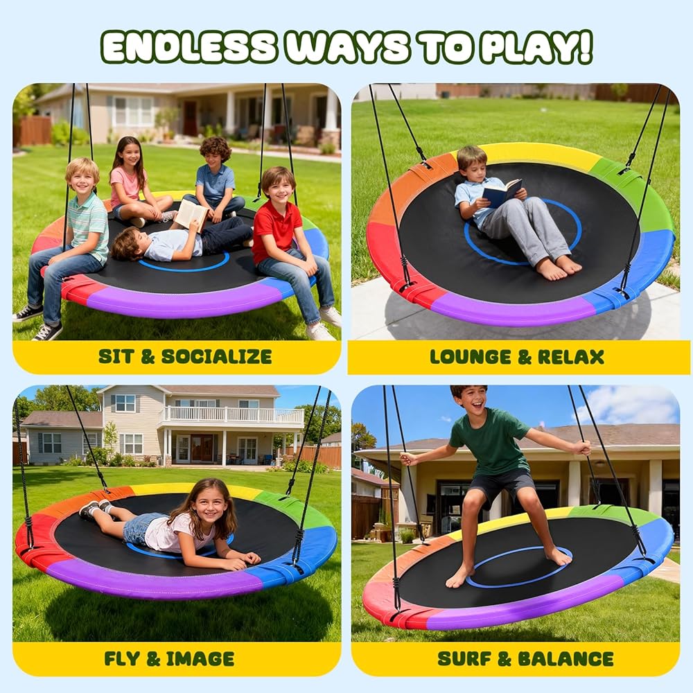 ✅أرجوحة دائرية متعددة الوظائف: اجلس أو استلقي أو قف أو تصفح على هذا القرص الكبير المتأرجح واستمتع بمتعة التأرجح في أي مكان تريده. يمكنك تركيب الأرجوحة الخاصة بنا في أي مكان تقريبًا بالداخل أو الخارج أو في الملعب أو الفناء الخلفي أو الحديقة أو تعليقها على مجموعة أرجوحة أو شجرة أو مجموعة لعب والمزيد.