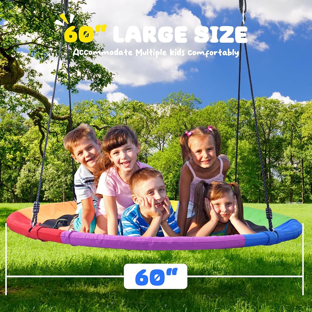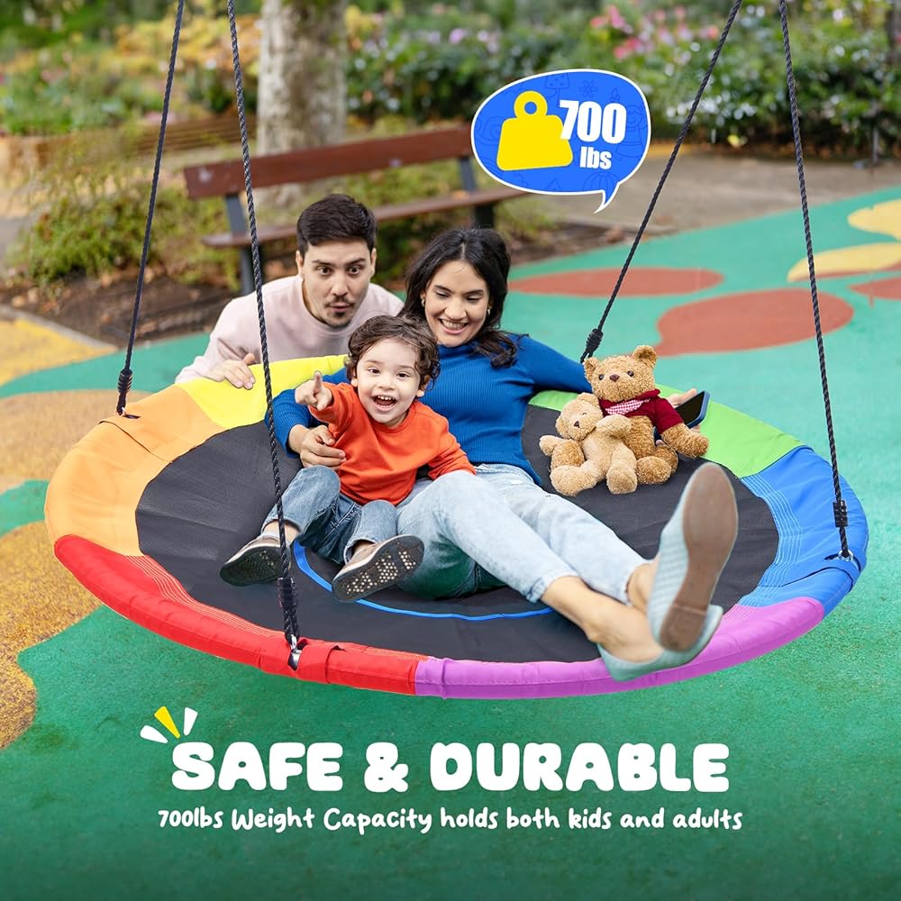 ✅أرجوحة صحن كبيرة: إطار فولاذي كبير مقاس 60 بوصة، سعة وزن عالية 700 رطل يمكن أن تستوعب كل من الأطفال والكبار بشكل مريح في نفس الوقت. يمكن لجميع أفراد العائلة الاستمتاع معًا على هذه الأرجوحة الكبيرة.
