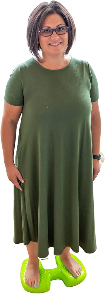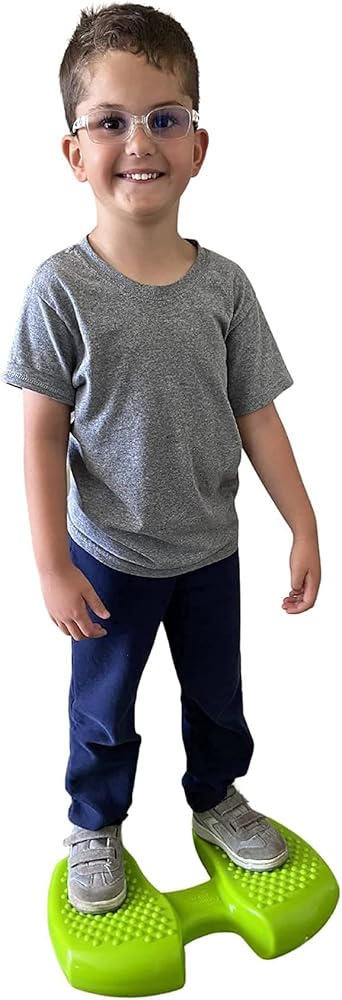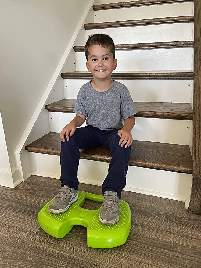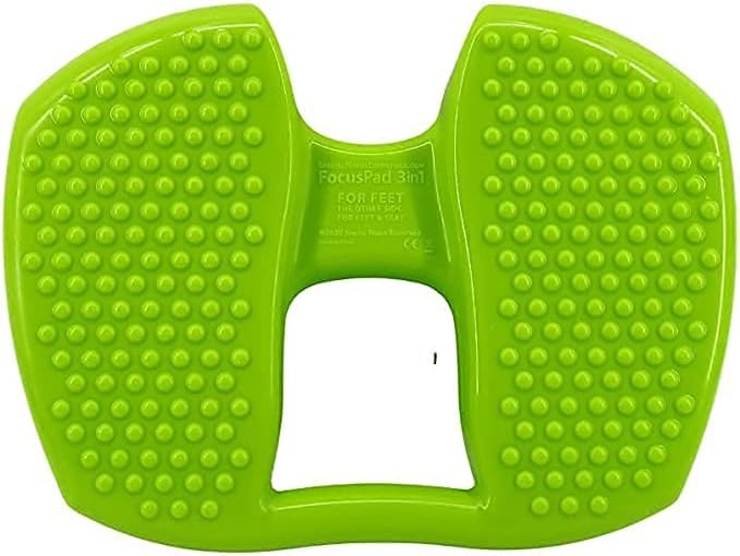 Special Needs Essentials FocusPad 3-in-1 is a silent sensory motor aid (for both kids and adults) used to facilitate movement while focusing on the task at hand at school, home, work or therapy. The FocusPad 3-in-1 has dual-sided texture - large bumps on one side and smaller tactile bumps on the other side. You can sit, stand or be seated with your feet on the FocusPad 3-in-1 (the sides are labeled for the user's specific actions). Rock, wobble, or simply just stay put - either way you will enjoy a sensory experience that provides calmness and increases focus with the FocusPad 3-in-1. Teachers will love the silent fidget motor aid to use underneath the desk, and it's portable, washable. The FocusPad 3-in-1 is available in a lime green color or blue and includes a pump to adjust firmness to user's preferred firmness. Features and Benefits of the FocusPad 3-in-1 include: Silently fidget to enhance ability to focus, Tactile stimulation to allow increased focus, Improve balance, coordination, gross motor skills. Includes hand pump to adjust FocusPad 3-in-1 firmness. Convenient handle provides portability. Fully washable. Ages 4 and up. Weight Capacity = 200 lb.