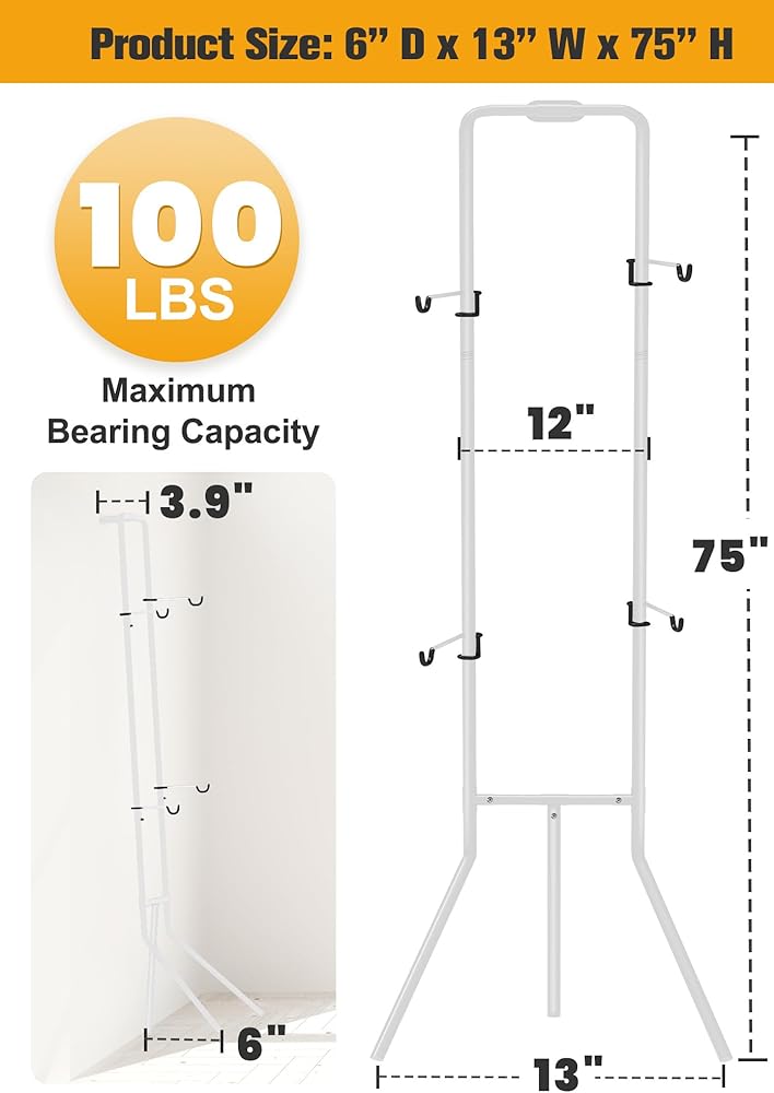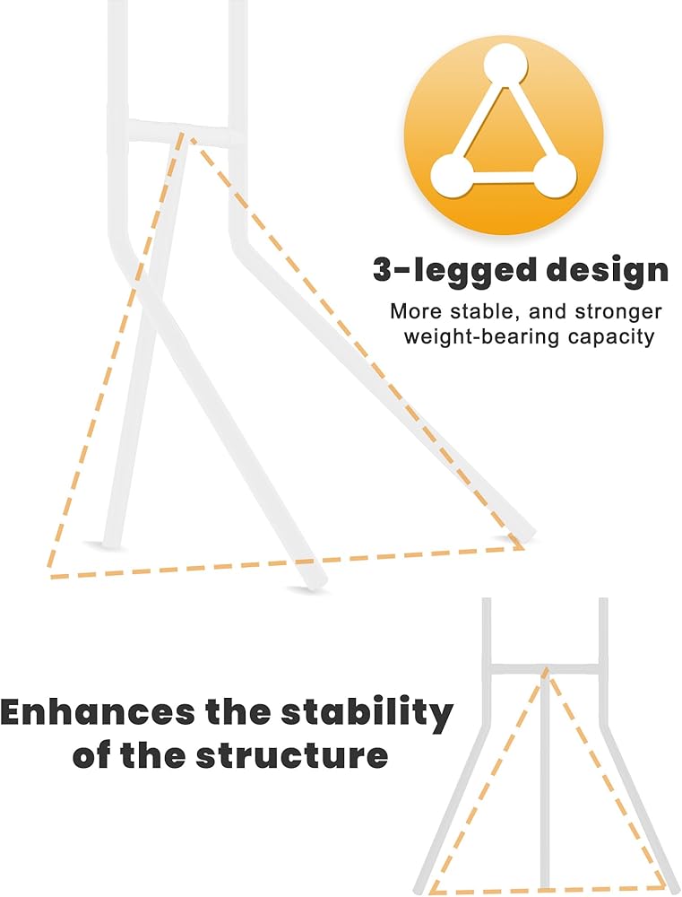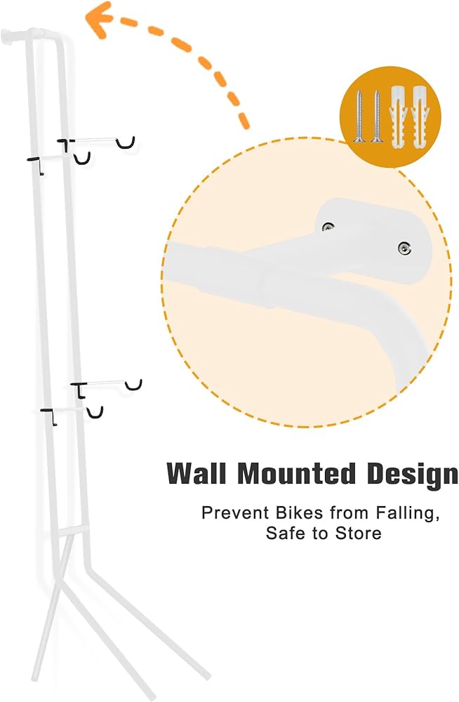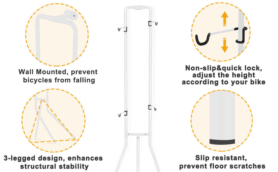 • تصميم مثبت على الحائط وثلاثة أرجل: يأتي حامل الدراجة مزودًا بمثبتات جدارية وتصميم ثلاثي الأرجل لتعزيز الثبات. يضمن ذلك بقاء حامل الدراجة العمودي ثابتًا في مكانه، حتى عند تحميله بالكامل. لا تعمل هذه الميزة على زيادة سعة وزن رف التخزين فحسب، بل تضيف أيضًا مستوى إضافيًا من الأمان عن طريق منع أي انقلاب أو تذبذب. علاوة على ذلك، فإن وسائد القدم البلاستيكية لا تمنع الانزلاق فحسب، بل تحمي أرضيتك من الخدوش أيضًا.