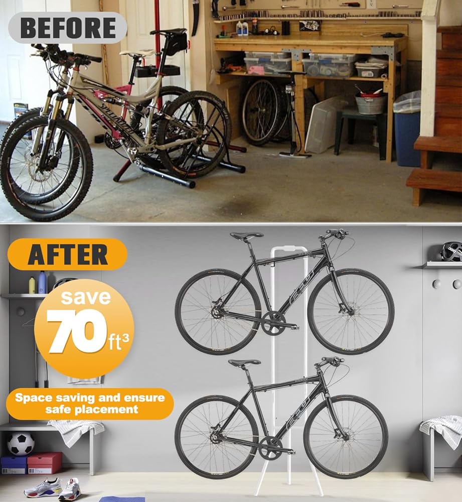 • تصميم موفر للمساحة: كوحدة قائمة بذاتها، يسمح لك رف الدراجة هذا باستخدام المساحة الرأسية بكفاءة. فهو يحافظ على دراجاتك بعيدًا عن الأرض، مما يوفر مساحة على الأرض ويساهم في خلق بيئة خالية من الفوضى. إنه حل مثالي للشقق الصغيرة أو المرائب أو أي منطقة تكون فيها المساحة مرتفعة.