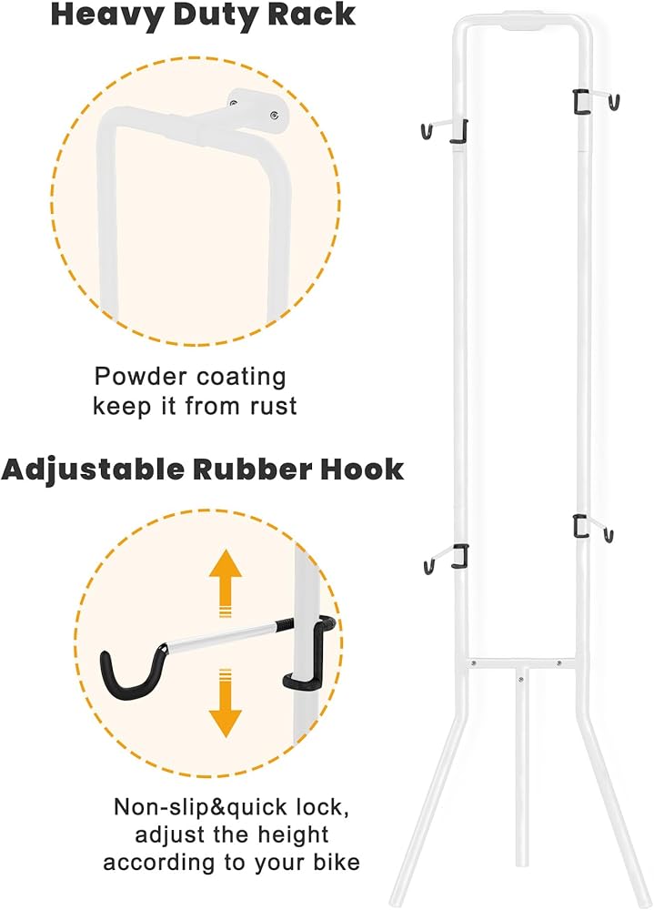 • خطاف قابل للتعديل غير قابل للانزلاق: مزود بـ 4 خطافات مطاطية مضادة للانزلاق، فهو يمنع الدراجات من الانزلاق بينما يحمي سطح الدراجات أيضًا من التآكل. يلبي الرف نماذج الدراجات المختلفة - يمكنه بسهولة تخزين دراجات الطرق والدراجات الجبلية ودراجات الأطفال (الأطفال) والدراجات الهجينة والمزيد. تمنحك إمكانية التعديل المرونة لترتيب الخطافات وفقًا لحجم ونمط دراجتك، مما يضمن تخزينًا آمنًا وفعالاً.