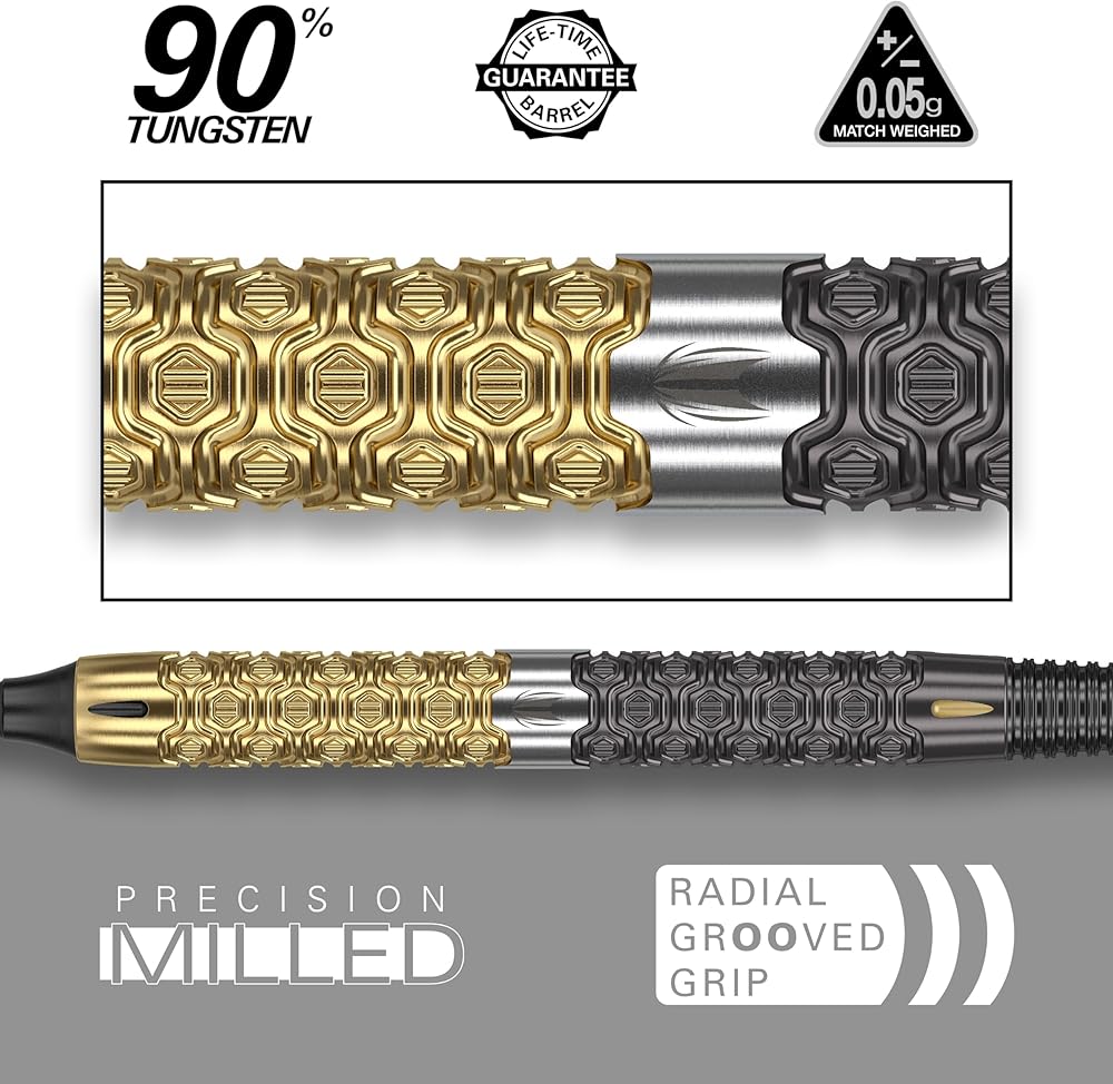 أسطوانات التنجستين بنسبة 90% - يضمن محتوى التنجستين العالي هذا أن تتمتع السهام بمظهر نحيف وأنيق، مما يسمح بدقة محددة ومجموعات ضيقة. تصميم البرميل 10 متوفر بوزن 18 جم (طول 52 مم، قطر 6.4 مم) و21 جم (طول 52 مم، قطر 6.7 مم). تم تصميم الطرف الناعم Pixel بواسطة Target لتقديم أداء عالٍ مع الحد الأدنى من الارتداد