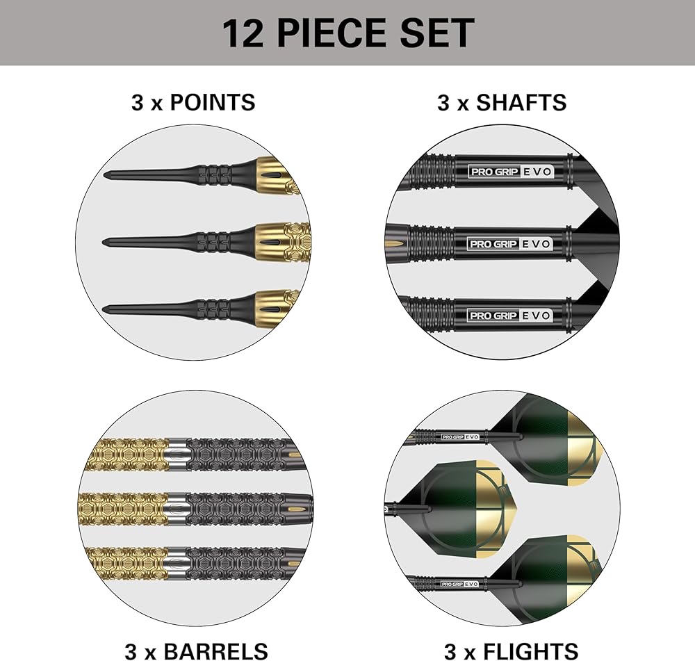 تحتوي العبوة على - 3 × 90% براميل تنجستن، 3 × نقاط طرف بكسل سوداء، 3 × أعمدة قبضة احترافية، 3 × رحلات طيران Pro.Ultra No.6