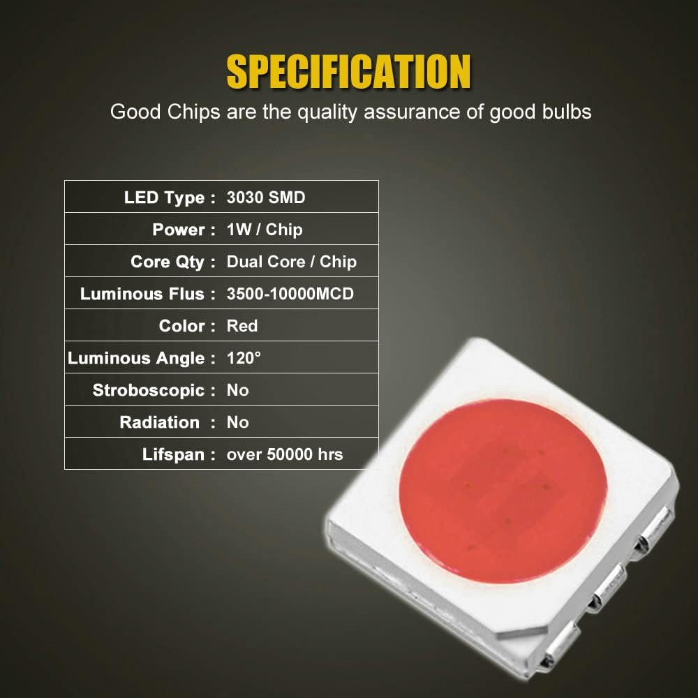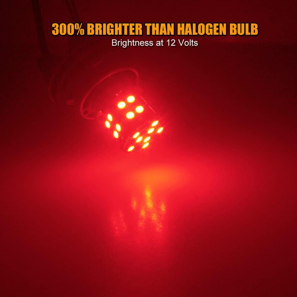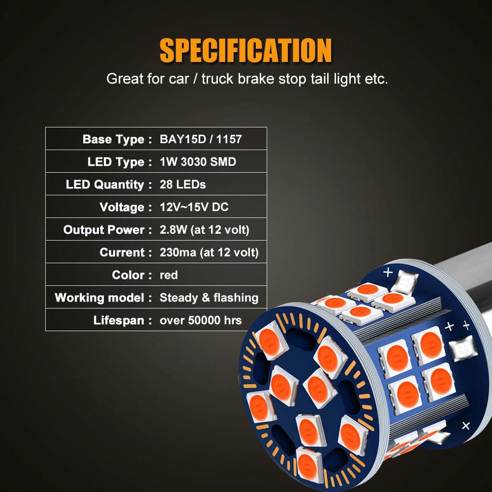 • Pack of 2-pc 1157 LED bulbs, 12V, 3030-SMD high brightness chipset, 28-LEDs per bulb, brilliant red color, 360 degree full angle illumination,long lifespan up to 50,000 hours, size: 0.75 inch in width, and 1.5 inch in length