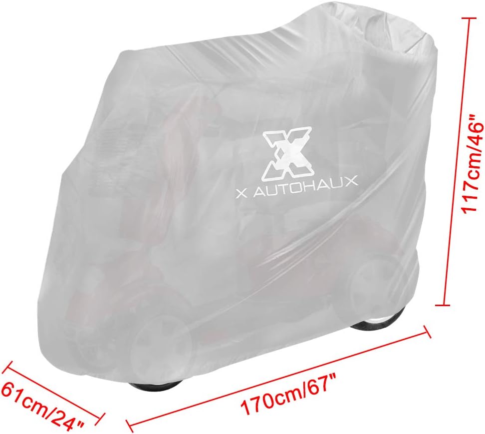 • [الحجم] 120x56x97 سم/48 بوصة × 22 بوصة × 38 بوصة (الطول × العرض × الارتفاع). مناسب لمعظم سكوتر كهربائي ذو ثلاث وأربع عجلات. يناسب الكرسي المتحرك اليدوي، أو المشاية، أو وسائل النقل التي تعمل بالطاقة الكهربائية أو سكوتر التنقل وما إلى ذلك.