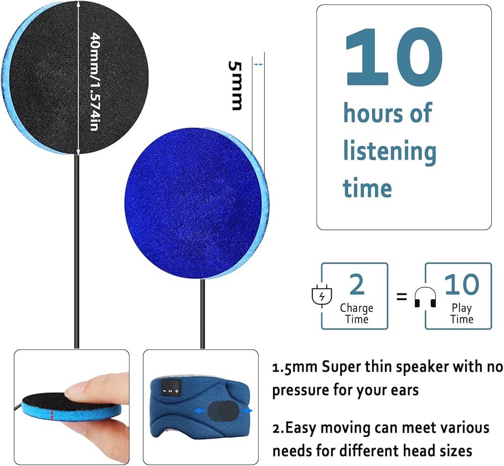 【مكبر صوت رفيع للغاية مطور، وقت تشغيل 10 ساعات】يتم وضع مكبرات صوت رفيعة للغاية مقاس 5 مم على قناع العين الخاص بك، ولا يسبب أي ضغط على أذنيك ويؤدي جودة صوت ستيريو ممتازة. تحتوي سماعات الرأس التي تعمل بتقنية البلوتوث على بطارية مدمجة عالية الأداء قابلة لإعادة الشحن بقدرة 180 مللي أمبير في الساعة. فقط قم بالشحن لمدة ساعتين ولكن يمكن أن توفر 10 ساعات من وقت اللعب، وهو ما يكفي لدعم طوال الليل.