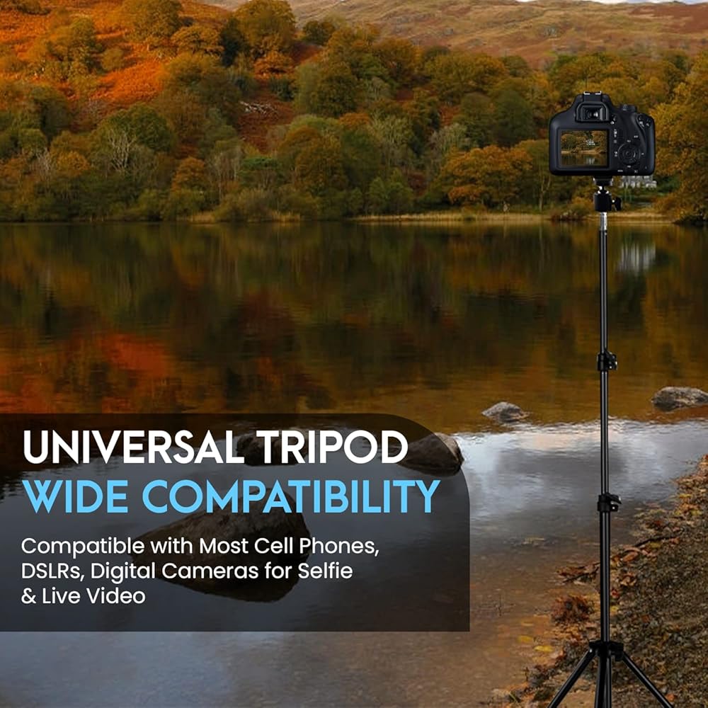 يشتمل على: حقيبة حمل ثلاثية القوائم مقاس 82 بوصة، ومشبك هاتف للرأس الكروي وجهاز تحكم عن بعد