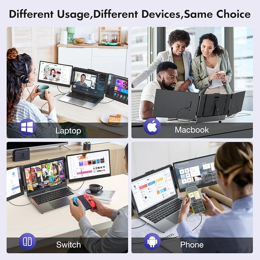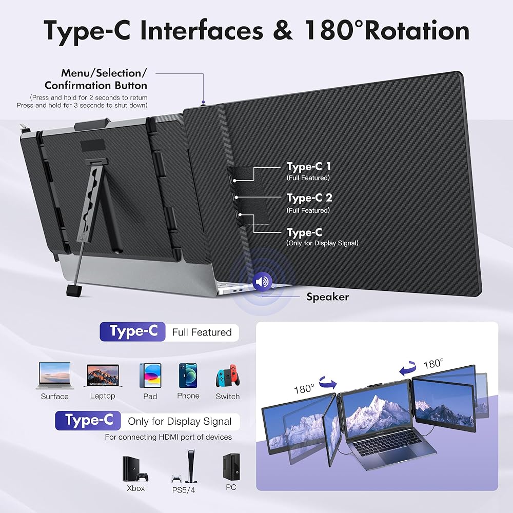 【شاشة عالية الجودة وزاوية قابلة للتعديل】تتميز الشاشة المحمولة الثلاثية للكمبيوتر المحمول بشاشات عرض كاملة مزدوجة مقاس 14 بوصة 1080 بكسل FHD IPS مع سطوع 300 شمعة في المتر المربع، مما يوفر نتائج عرض ممتازة. يمكن تدوير كلتا الشاشتين الممتدتين بمقدار 180 درجة للأمام، مما يسمح لك بالتكيف مع المنظور المريح الذي يناسبك. وفي الوقت نفسه، يمكن لموسع شاشة الكمبيوتر المحمول المزدوج أيضًا دعم أوضاع متعددة مثل المرآة/التمديد، مما يسمح لك باستخدامها بحرية.