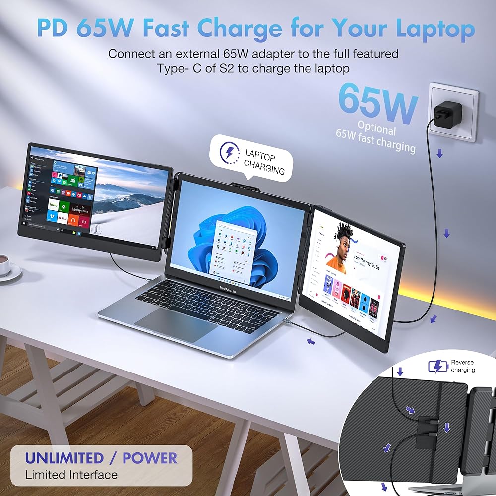 【سهلة الاستخدام ومحمولة】 شاشة الكمبيوتر المحمول المحمولة Kwumsy S2 من السهل ربطها بالكمبيوتر المحمول دون أي ملحقات أخرى مثل المغناطيس. يمكنها دعم أقصى عرض لشاشة الكمبيوتر المحمول 405 مم. أيضًا موسع شاشة الكمبيوتر المحمول نفسه يحتوي على حامل قابل للتعديل يدعم استقرار جميع الشاشات. يبلغ وزن المجموعة الكاملة من الشاشات المحمولة الثلاثية للكمبيوتر المحمول 3.57 رطل فقط وهي خفيفة الوزن ورفيعة. من السهل تخزينها في الحقيبة التي قدمناها ومريحة جدًا للحمل أثناء السفر.