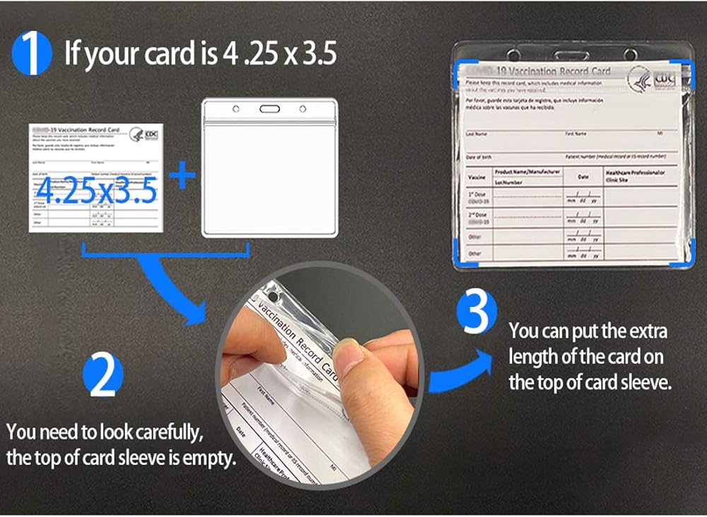 • [حجم البطاقة]: يرجى ملاحظة: قد يختلف حجم بطاقة التطعيم، يرجى التحقق من القياسات قبل الشراء. الحد الأقصى لحجم بطاقة التطعيم المناسبة هو 4 بوصة طول × 3 بوصة عرض. إذا كنت تعتقد أن حامل البطاقة (حجم بطاقة آخر 4 1/4X3 1/2) غير مناسب، فقط اقلبه وقم بتحريك الجزء العلوي من الأسفل وسيغلق. مغلق.يرجى الرجوع إلى الشكلين الثاني والثالث.