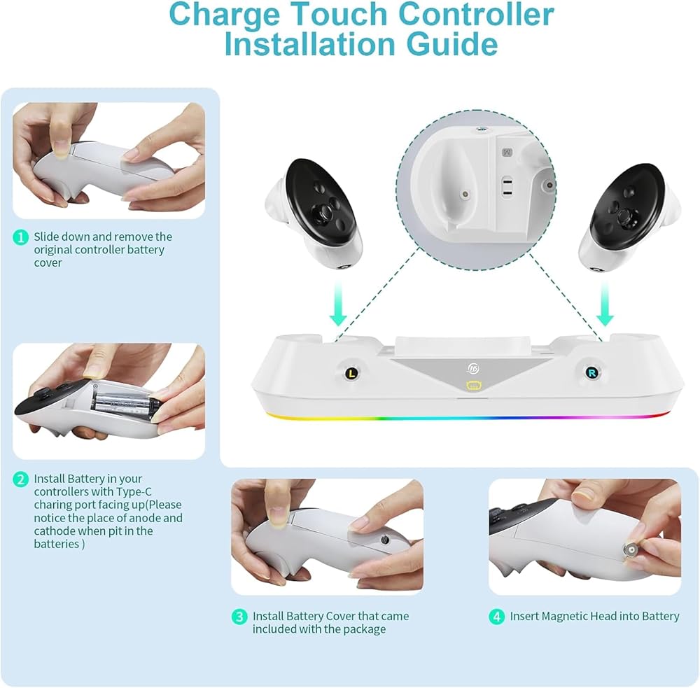 قاعدة شحن لمحطة الإرساء المغناطيسية Oculus/Meta Quest 3 مع ضوء LED، وحامل عرض سماعة الرأس وحامل وحدة التحكم، 2 * بطاريات قابلة لإعادة الشحن 1800 مللي أمبير في الساعة
