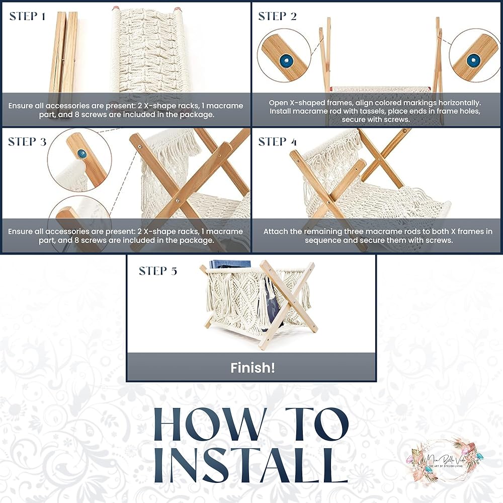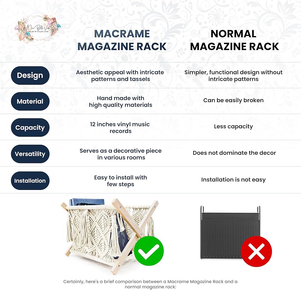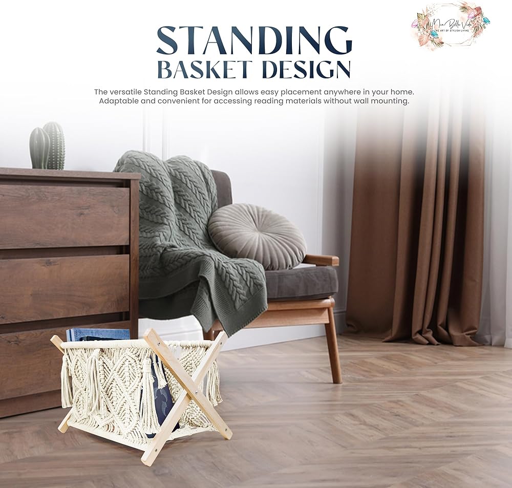 𝐕𝐚𝐫𝐢𝐞𝐭𝐲 𝐨𝐟 𝐂𝐨𝐥𝐨𝐫𝐬 𝐚𝐧𝐝 𝐃𝐞𝐬𝐢𝐠𝐧𝐬: Mia Bella Vida offers a wide range of colors and designs for the Macrame Magazine Rack. This allows you to choose the one that best matches your interior decor, ensuring that it complements your style and color scheme seamlessly. With multiple options, you can find the perfect fit for your home. These features highlight the product's blend of functionality and style, making it an attractive choice for those looking to enhance their home de