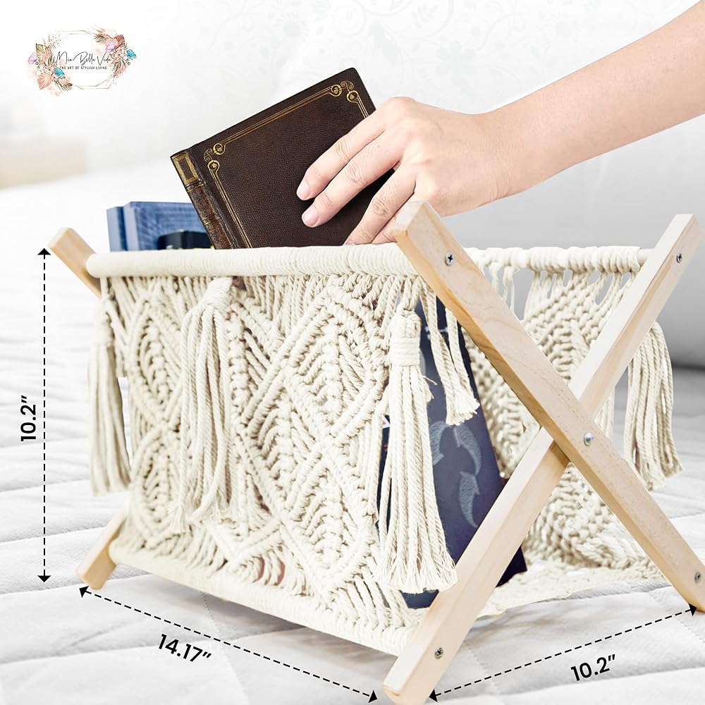 The Mia Bella Vida Macrame Magazine Rack - the perfect fusion of boho-inspired home decor and functional storage. Elevate your living space with this stunning, handcrafted piece that seamlessly blends style and utility. This magazine rack is designed to cater to all your storage needs, all while adding a touch of bohemian charm to your home.