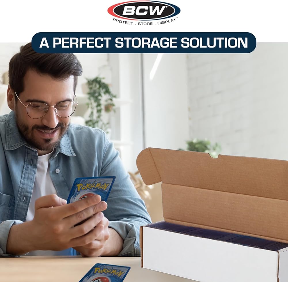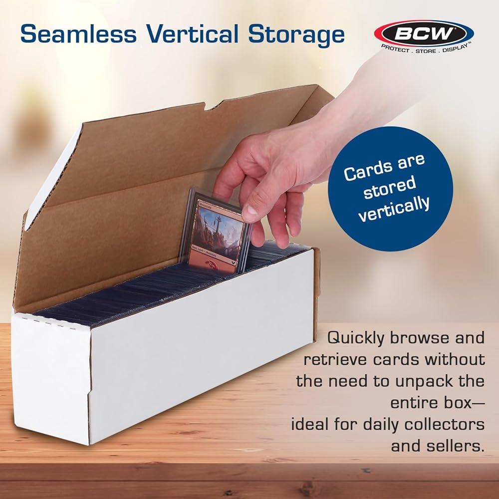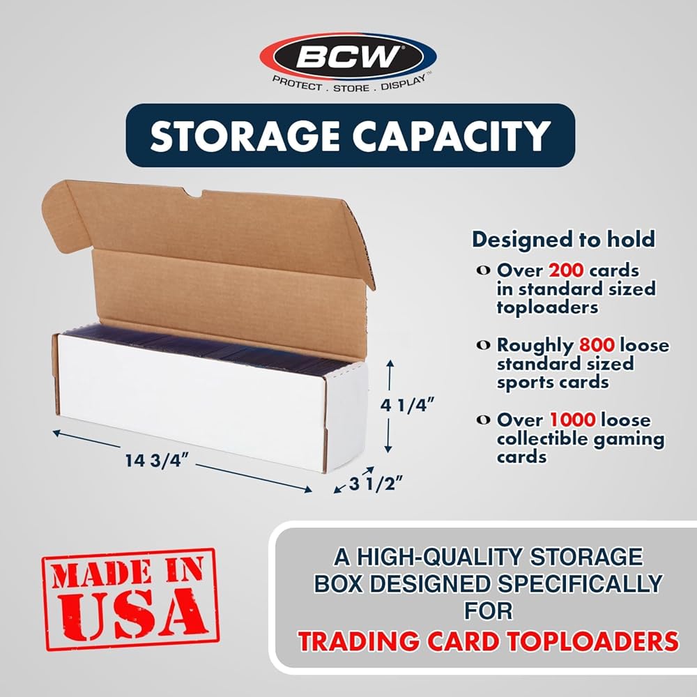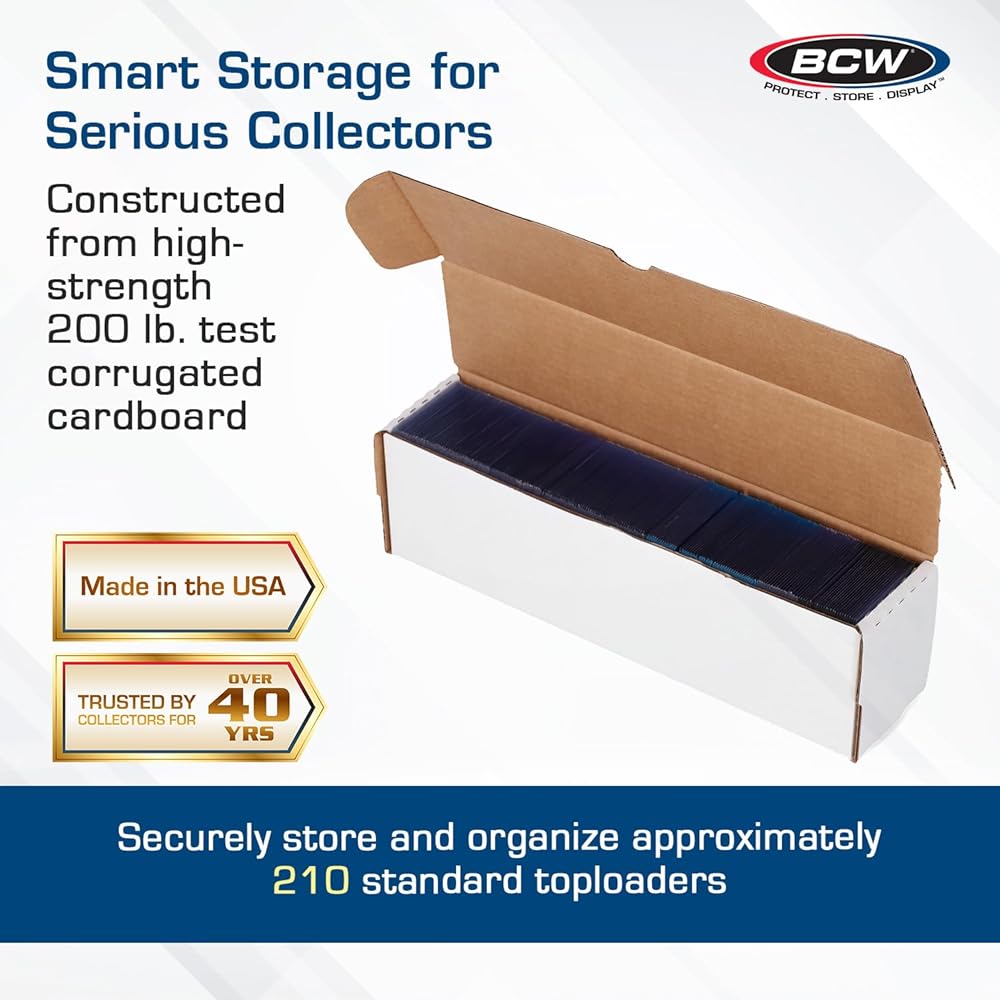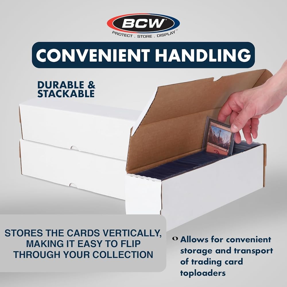The BCW Toploader Storage Box is the ideal solution for storing your cards which are in toploaders. The box holds over 200 cards in standard thickness toploaders. It can also hold unsleeved cards and cards in penny sleeves. For unsleeved cards it can hold roughly 800 sportscards of standard thickness, and over 1000 gaming cards. The box stores the cards vertically, making it easy to flip through your collection.The toploader box is perfect for baseball cards, basketball cards, football cards, soccer cards, and a broad selection of gaming cards such as Magic: The Gathering (MTG), Pokemon, Yu-Gi-Oh!, Dragon Ball, and other popular Trading Card Games (TCG's) and Collectible Card Games (CCG's).The BCW Toploader Storage Box has been engineered for the protection of your cards. Its design allows cards to stand vertically, for convenient browsing. Note that this box is not designed to hold graded cards. BCW offers a number of boxes designed specifically for graded cards.Built for durability, the BCW Toploader Storage Box is constructed from high-quality, white corrugated cardboard, boasting a 200 lb. test strength. This means it is long-lasting, stackable, and sturdy, designed to keep your card collection safe. Its design features tabs for closure, minimizing the risk of damaging your cards.Finally, the BCW Toploader Storage Box is straightforward to put together. It does not require any tools, allowing you to organize your card collection efficiently.
