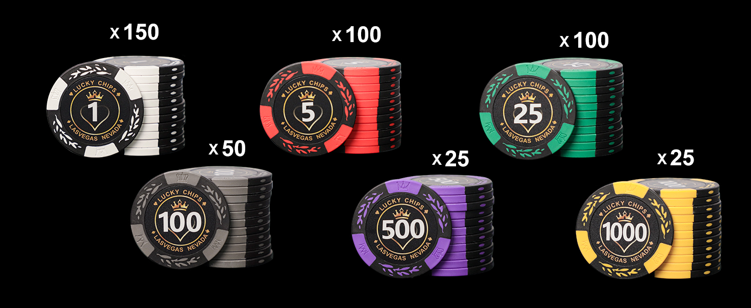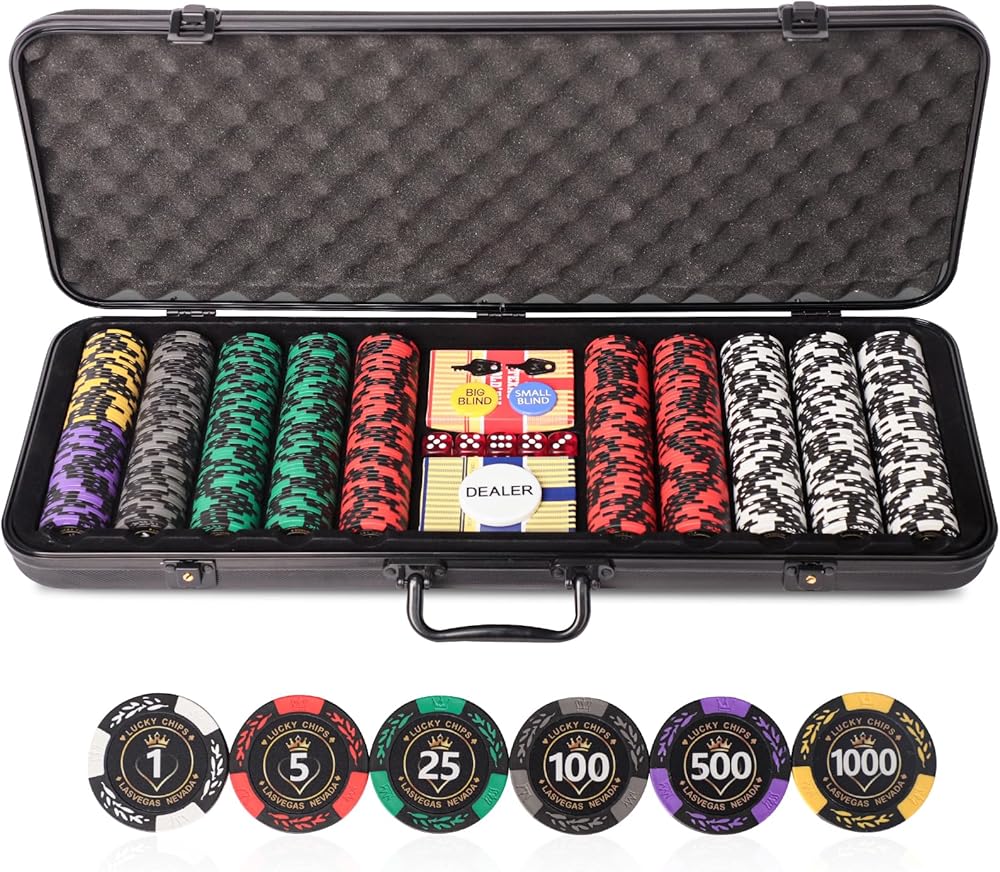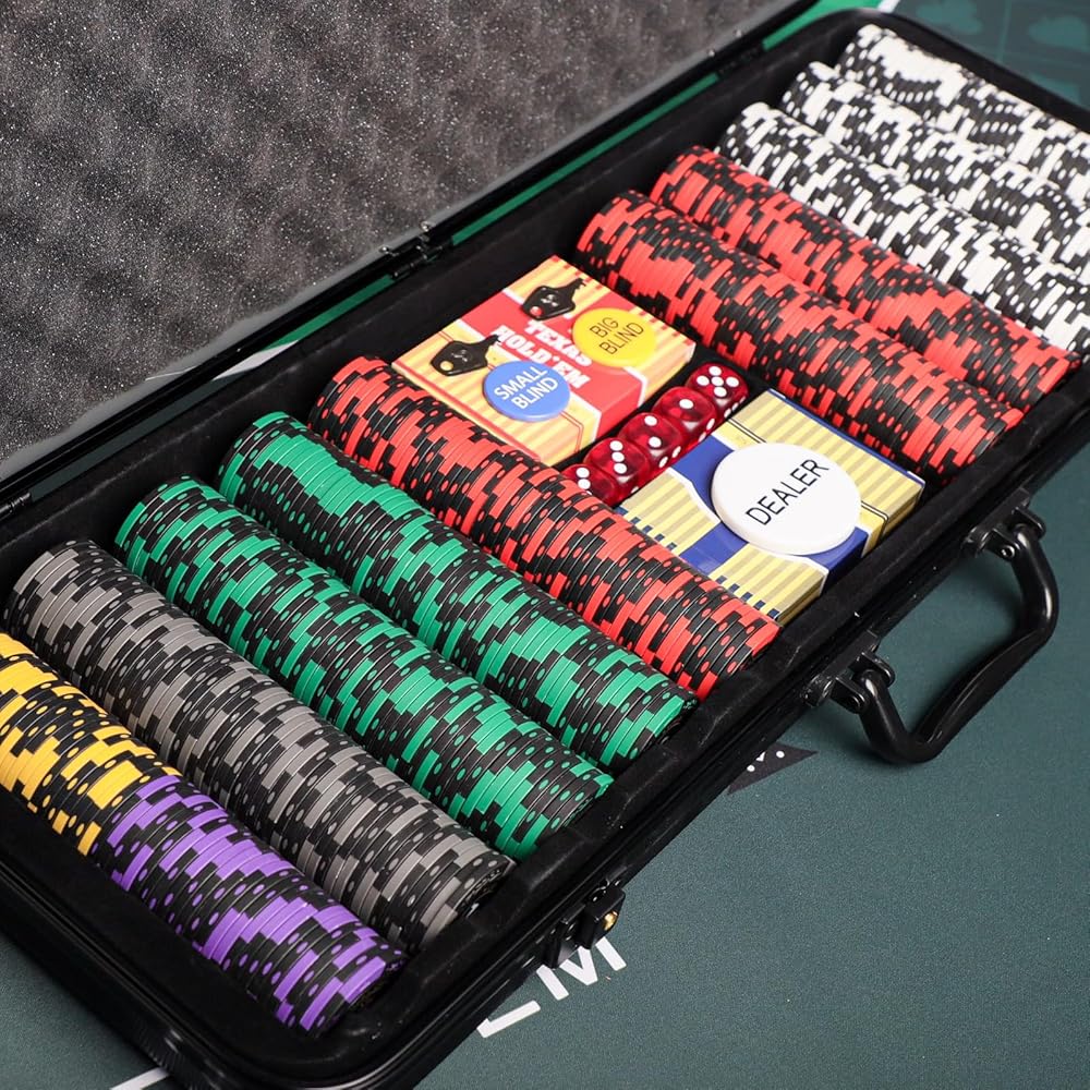 【تفاصيل المنتج】مجموعة رقائق البوكر الطينية المكونة من 500 قطعة تتضمن: 25 رقاقة صفراء، 25 رقاقة أرجوانية، 50 رقاقة رمادية، 100 رقاقة خضراء، 150 رقاقة حمراء، 150 رقاقة بيضاء، مجموعتين من البطاقات، 5 نرد، 1 زر موزع، 1 كبير زر أعمى، 1 زر أعمى صغير، 1 حقيبة حمل من مادة أكريلونتريل بوتادين ستايرين، ومفتاحين.