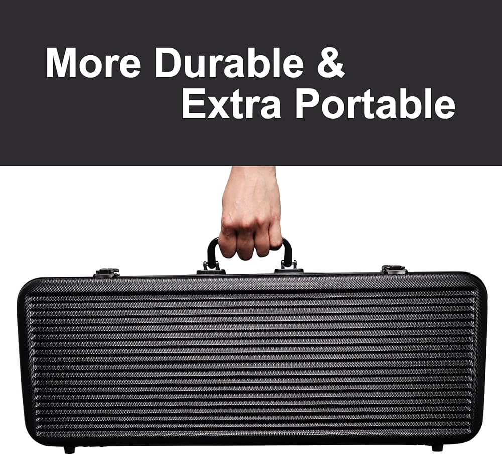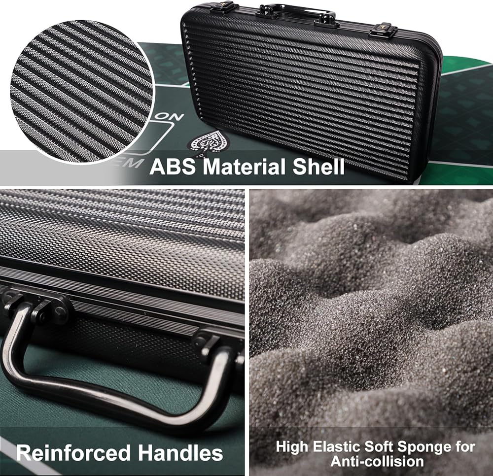 【حقيبة حمل متينة ومحمولة】 تأتي مجموعة رقائق البوكر ذات الطوائف في حقيبة حمل عصرية، بقياس 22.24 بوصة طول × 8.27 بوصة عرض × 2.56 بوصة ارتفاع. وتتميز بمقبض مريح وبطانة إضافية لحماية الرقاقة. تم تصميم العلبة مع مزالج قابلة للقفل للنقل والتخزين الآمن.ملاحظة: يتم تضمين مفتاحين داخل العلبة.