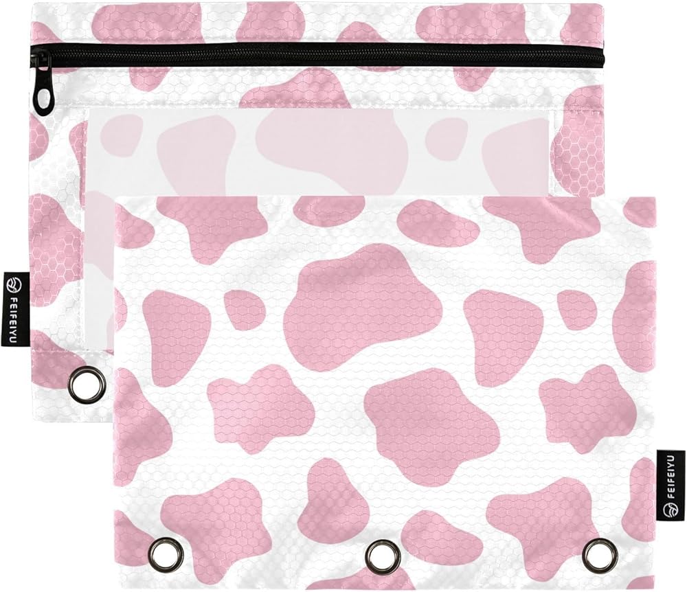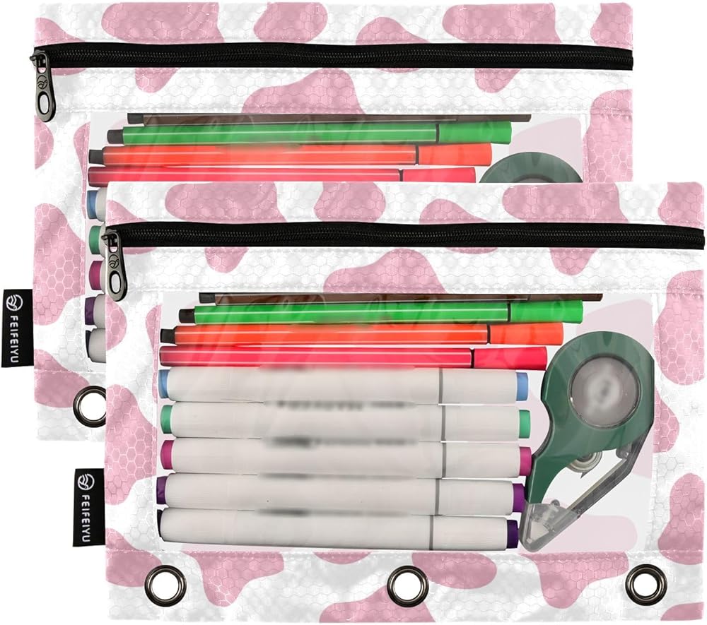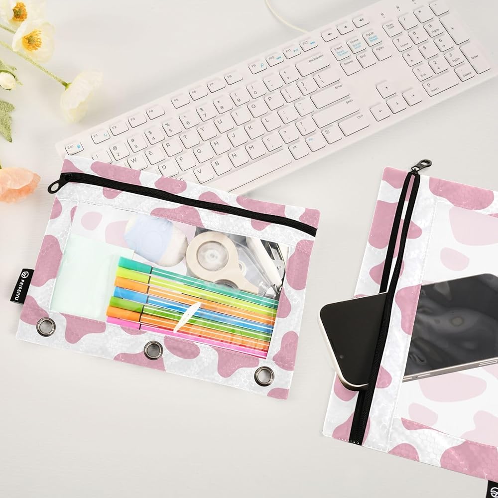 أكياس قلم رصاص مطبوعة على شكل بقرة وردية، 2 علبة مقلمة بسحاب لـ 3 حلقات مع نافذة شفافة من البولي فينيل كلوريد، أكياس أقلام بوليستر متينة مقاومة للماء