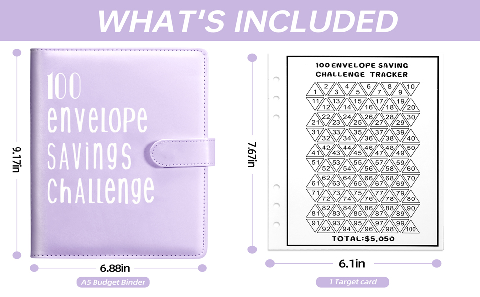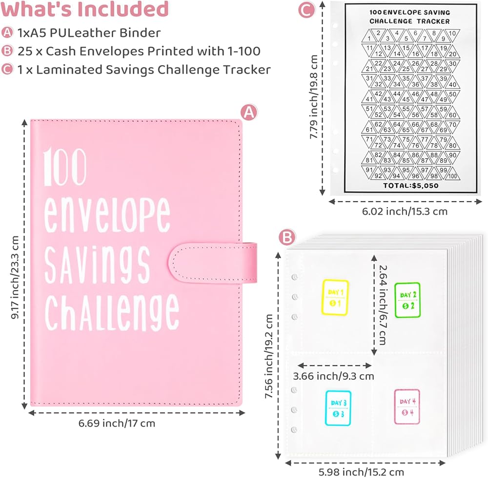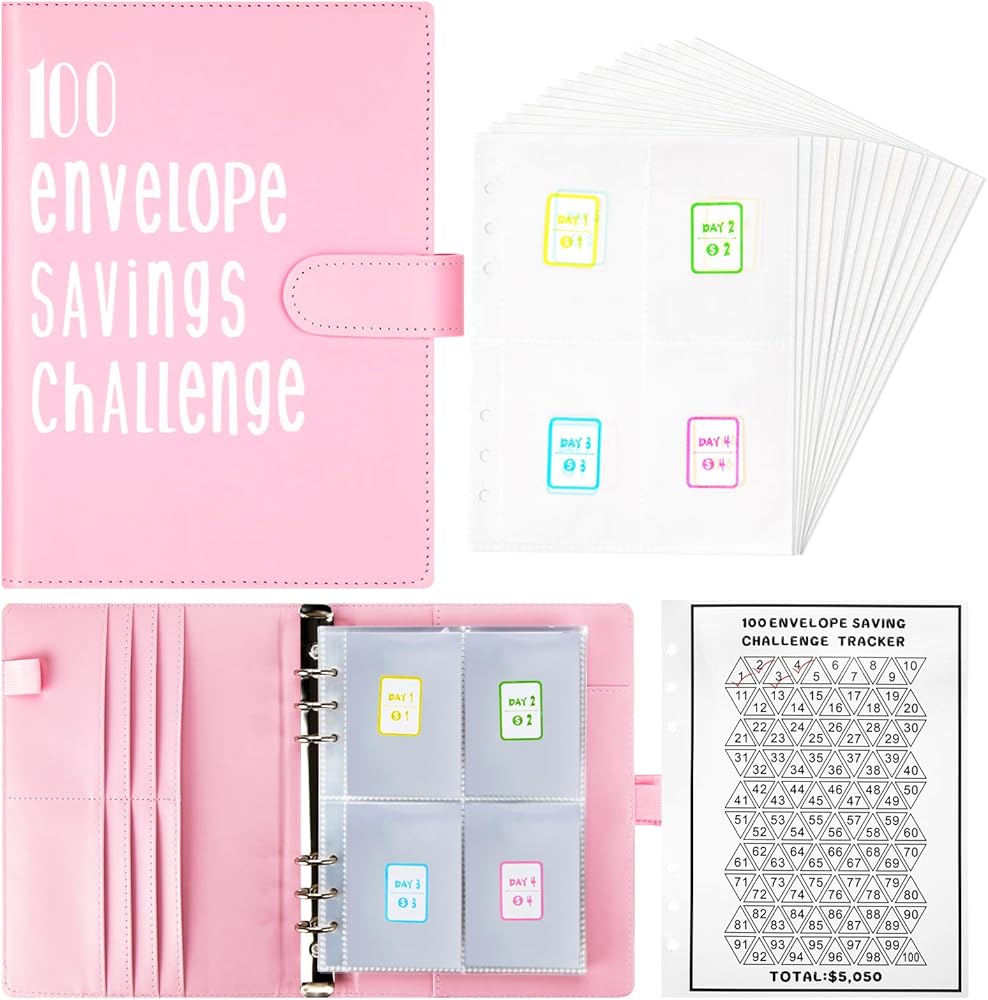 [كتاب تحديات الادخار مع الأظرف] ابدأ تحدي توفير المال الآن باستخدام مجلد بحجم A5 (طوله 9 بوصات × عرضه 7 بوصات)، وجهاز تعقب مصفح قابل لإعادة الاستخدام، و100 كيس مرقم لتوفير 5050 دولارًا بالطريقة التقليدية.