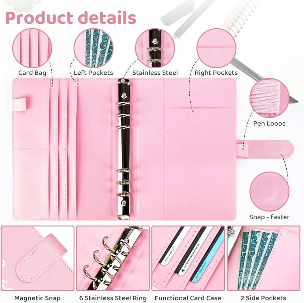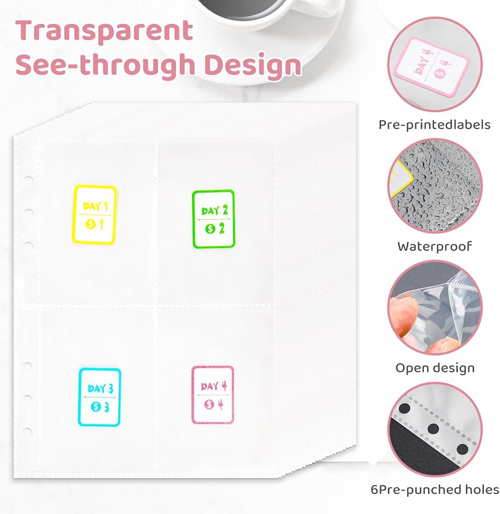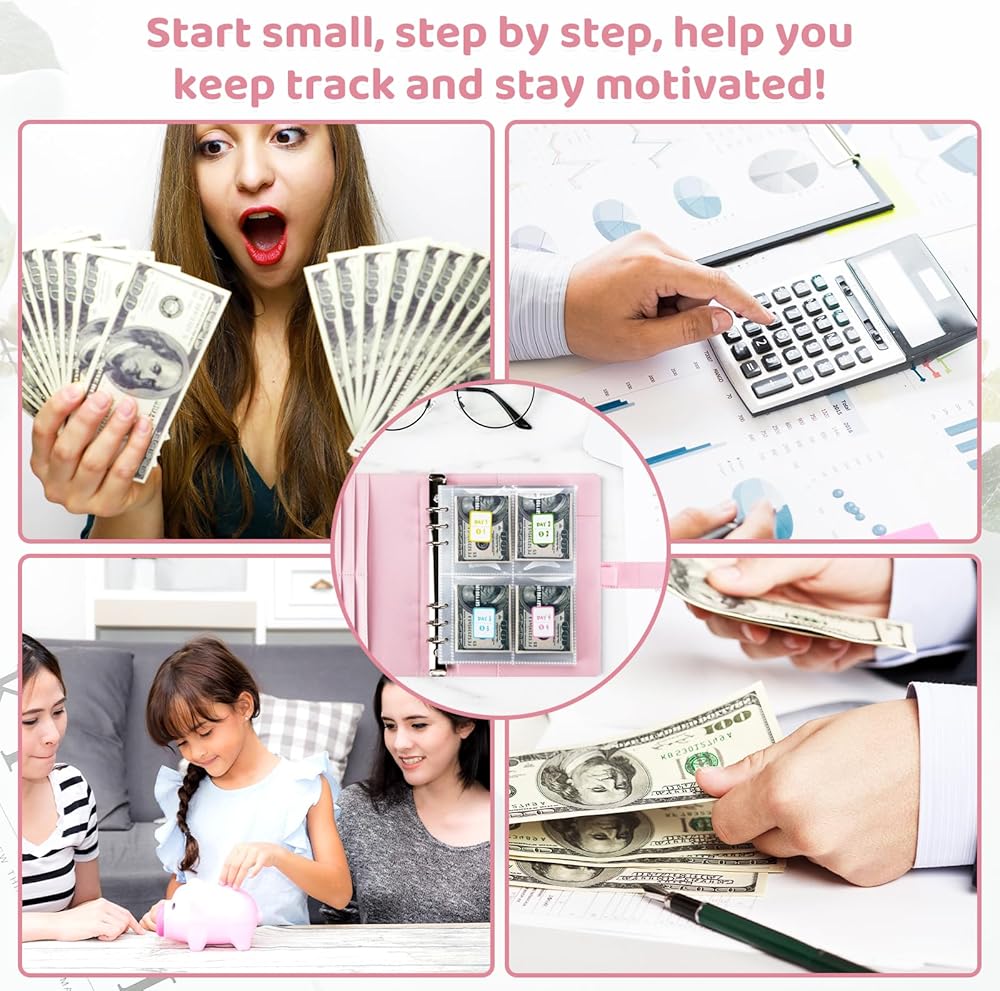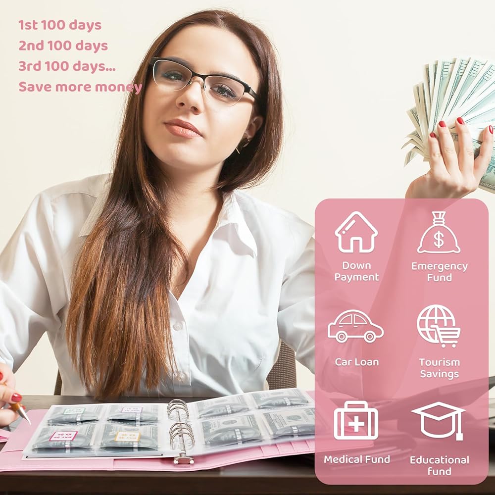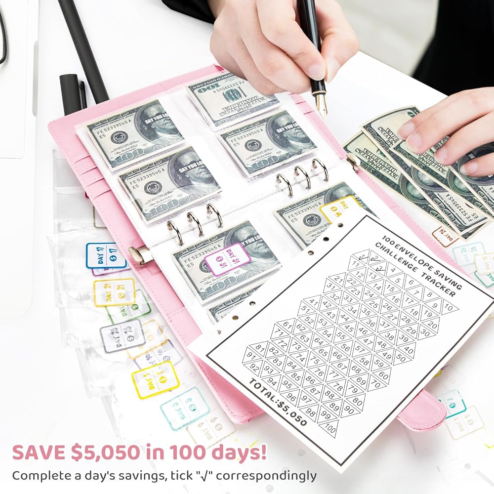 [مجلد توفير المال لتحدي 100 يوم] مصنوع من جلد البولي يوريثان المتين، المجلد بحجم A5 مقاوم للخدش ومريح عند اللمس. تحمي أظرف النقود الشفافة والمقاومة للماء ممتلكاتك من الماء والغبار، مما يجعلها مثالية لتخزين النقود والعملات المعدنية والفواتير والإيصالات وغيرها من الأشياء الصغيرة.