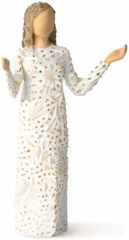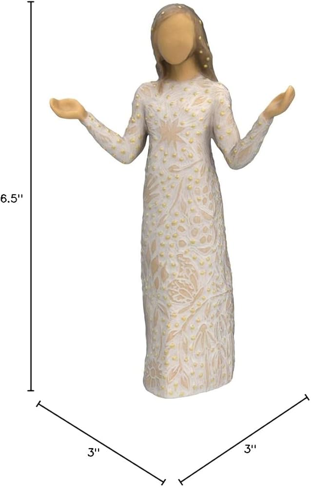 • مجسم واقف من الراتنج مطلي يدويًا بقياس 16.5 سم في فستان كريمي، وأذرع مرفوعة إلى الجانبين مع مرفقين منحنيين. اللباس منقوش على نطاق واسع برموز الزهور وأوراق الشجر والطيور والفراشات. تطبيق ورقة الذهب