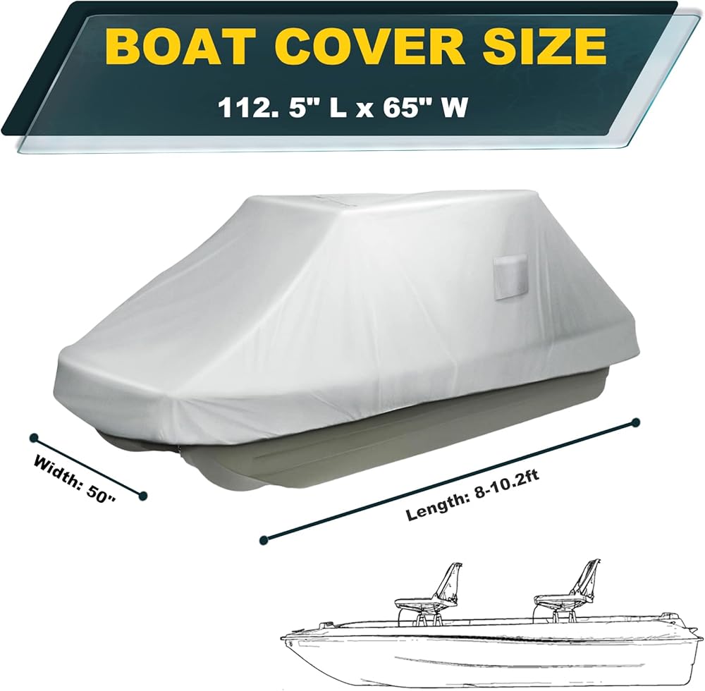 BOAT COVER DIMENSIONS: The length of the boat cover is 8-10.2 ft (96"-122.4") with the beam up to 50", fits most pond or bass boats (Perfectly compatible with Pelican Bass Raider 10E Angler Fishing Boat). Please refer to the picture for the size measurement method and order the closest to your boat size for the best fit.