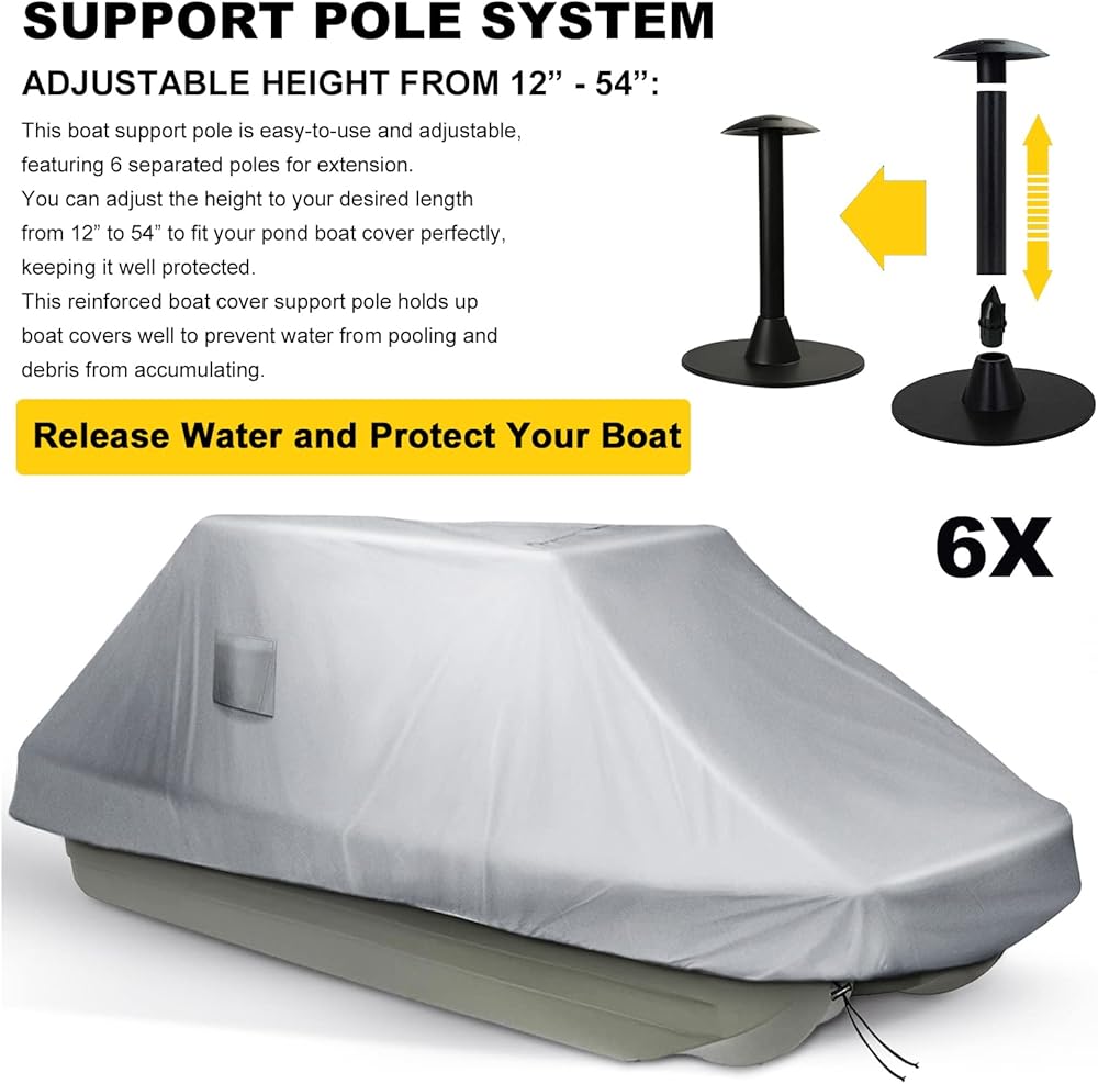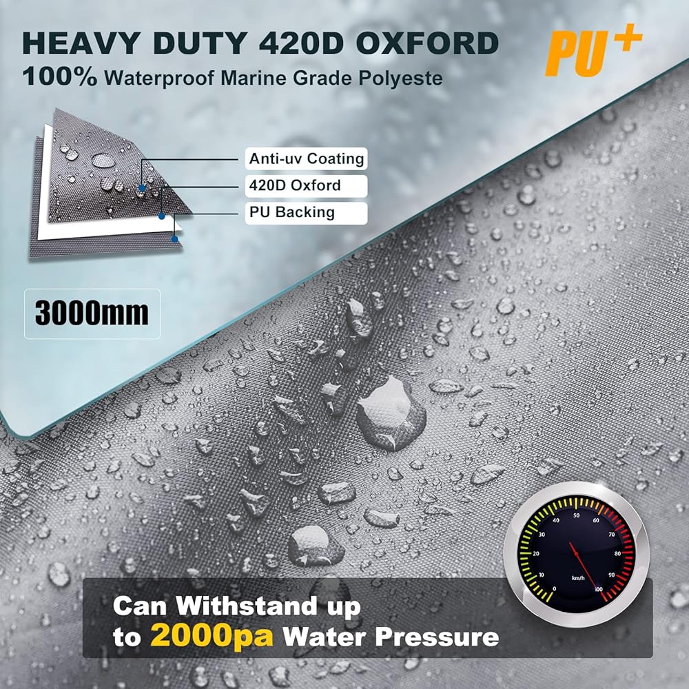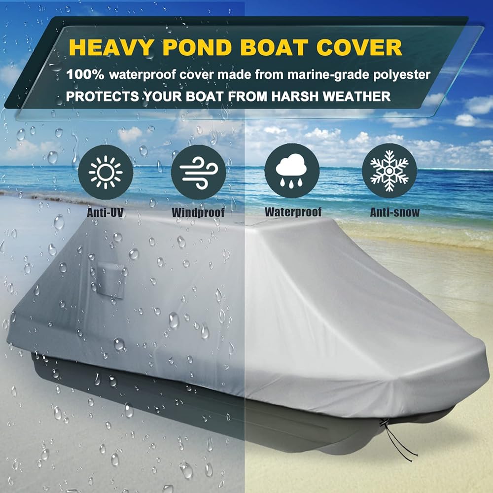100% WATERPROOF BOAT COVER: This pond boat cover is made of heavy duty 420 denier marine grade fabric and coated with a PU layer that is weatherproof, waterproof and tear resistant. The entire boat cover is double stitched and the strong seams can prevent the boat cover from tearing.
