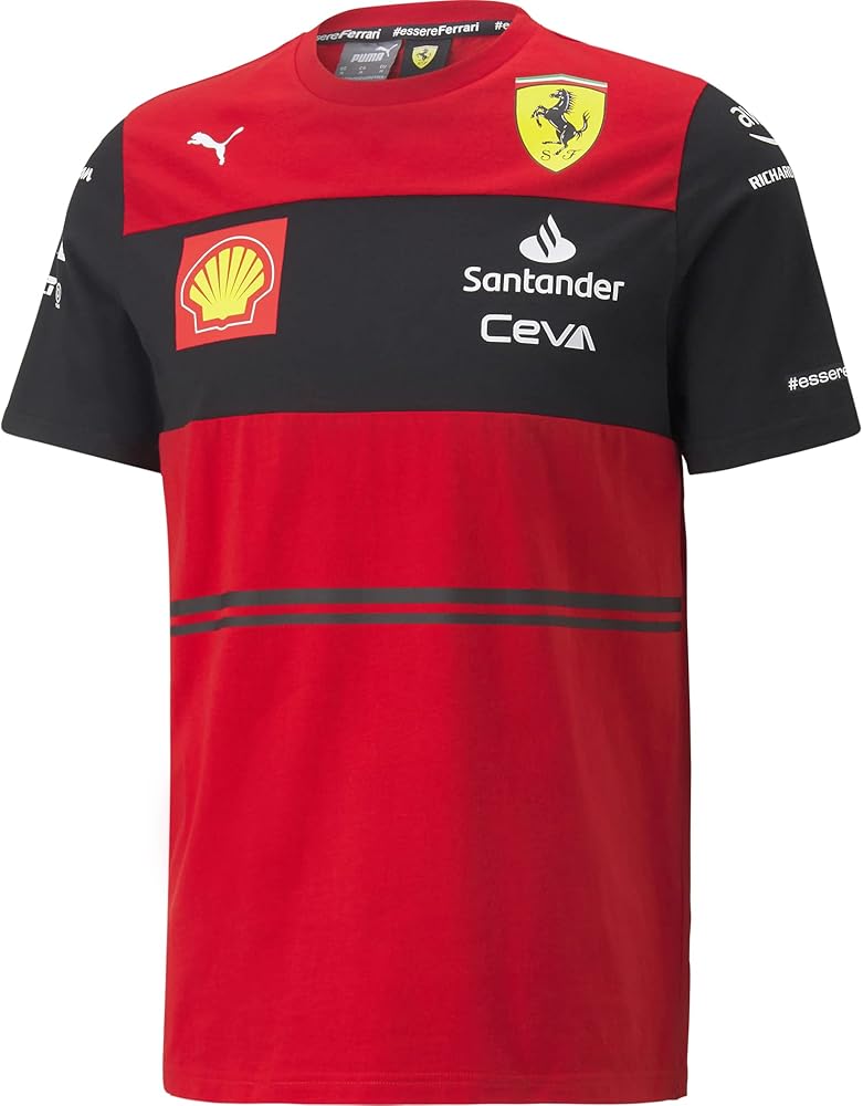 As worn by the Scuderia Ferrari Formula 1 team at Grand Prix weekends. The official 2022 team t-shirt features the powerful Ferrari 'Scudetto' logo on the chest with an updated "Rosso Corsa" red and black design leaving fellow fans in no doubt as to your tifosi allegiance. The authentic classic fit PUMA x Scuderia 2022 Ferrari team t-shirtis made from 100% cotton, with all the 2022 Scuderia Ferrari partner logos as seen on Ferrari F1 cars and team outfits, including Shell and Pirelli. Essere Ferrari roughly translates as 'being Ferrari' and wherever the Ferrari Formula 1 team go the famous tifosi follow, adorned in Ferrari merchandise and carrying an enthusiasm and passion to rival any team. This official PUMA x Scuderia Ferrari 2022 Team t-shirt is designed and produced by PUMA in partnership with Scuderia Ferrari and is part of the official 2022 Ferrari F1 Team merchandise collection