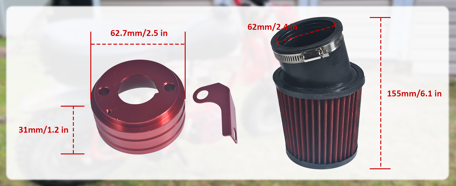- فلتر الهواء: 2-7/16 بوصة = 62 مم المحول: ارتفاع المدخل: 31 مم (1-1/4 بوصة) القطر الخارجي: 62.5 مم (2-7/16 بوصة) 57 مم (2-1/4 بوصة) ) يفتح عند أوسع نقطة وصولاً إلى فتحة مقاس 23.8 مم (15/16 بوصة).