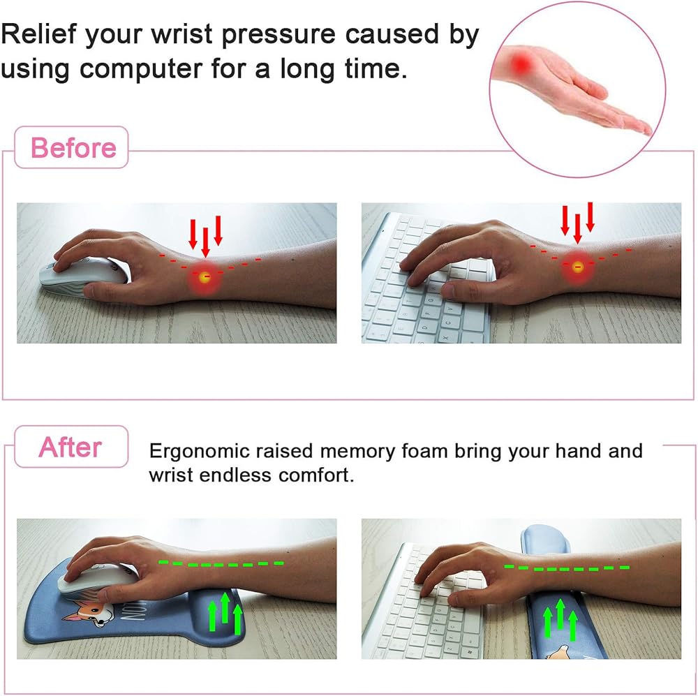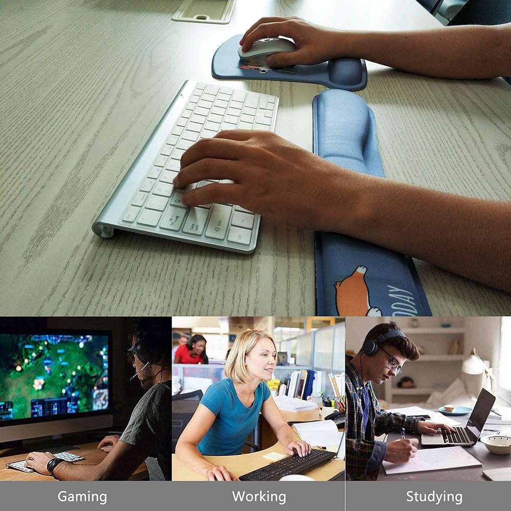 تصميم مريح: يتميز مسند المعصم للوحة المفاتيح ولوحة الماوس مع مسند المعصم بتصميم منحني الشكل، ويناسب المعصم تمامًا. يحافظ على معصمك في حالة طبيعية ومريحة. الحد الأقصى لتخفيف إجهاد المعصم والتعب، وتخفيف الألم. مثالية للعمال واللاعبين والطلاب.