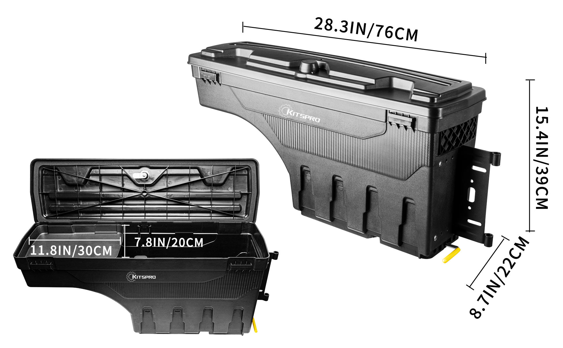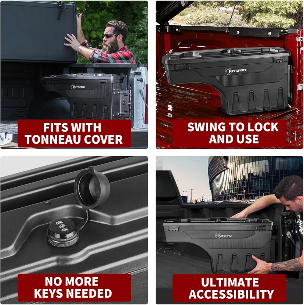 ✔[إمكانية الوصول القصوى] يتأرجح صندوق أدوات سرير الشاحنة KitsPro للخارج حوالي 180 درجة لسهولة الوصول من خلال الباب الخلفي ويتأرجح مرة أخرى إلى وضع مغلق فوق آبار العجلة لتحقيق أقصى قدر من الوصول إلى المخرطة. (تحذير: إذا كانت شاحنتك مزودة ببطانة سرير أو سجادة، فقد تحتاج إلى تقليم بطانة السرير أو السجاد بشكل صحيح وتثبيت الدعامة على الصفائح المعدنية لسرير الشاحنة قبل تثبيت صندوق الأدوات).