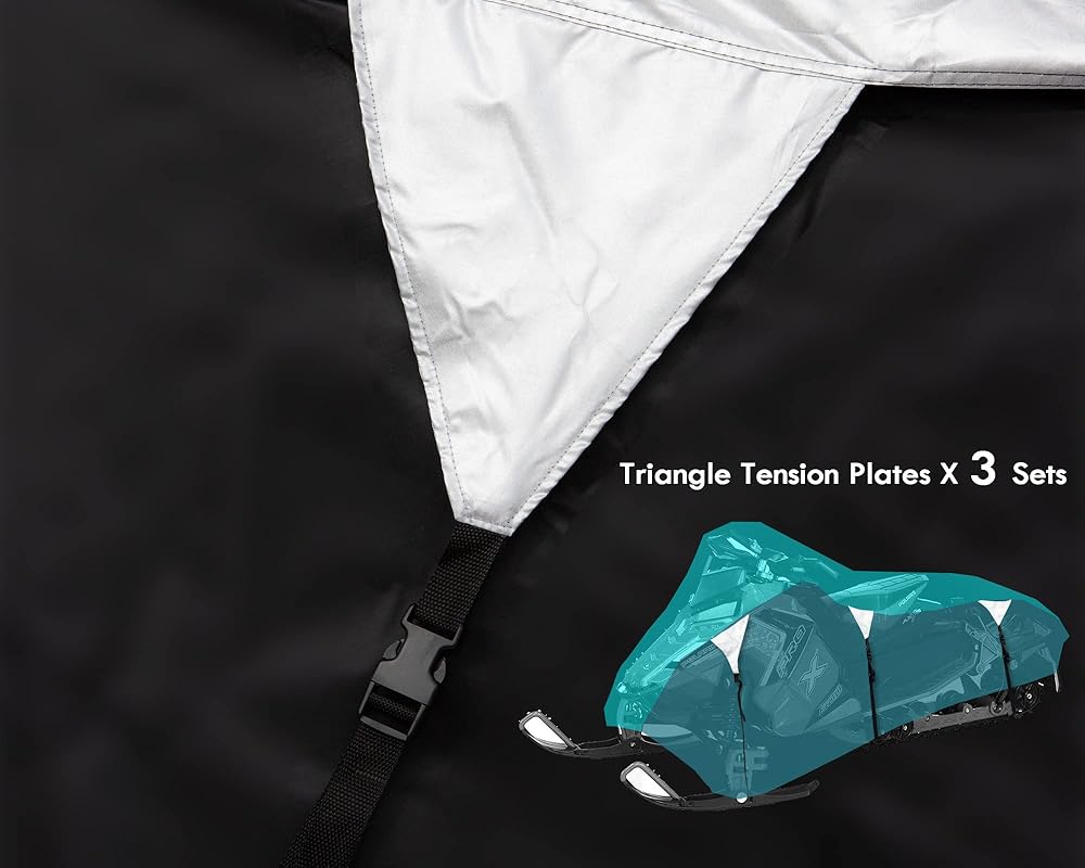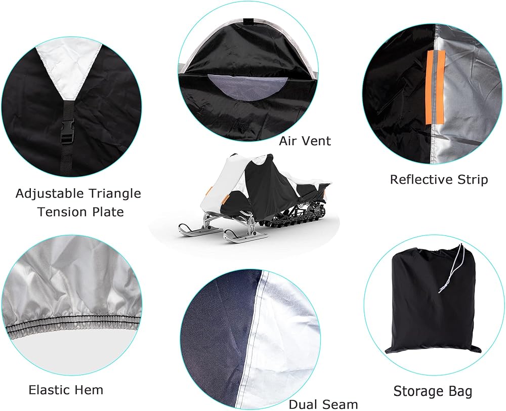 【مقاومة للرياح】الحاشية المرنة للغطاء في الجزء الأمامي والخلفي من زلاجة الثلج تجعل الغطاء مناسبًا تمامًا، كما أن 3 مجموعات من ألواح الشد المثلثة القابلة للتعديل تعمل على تأمين الغطاء بإحكام أثناء السفر.