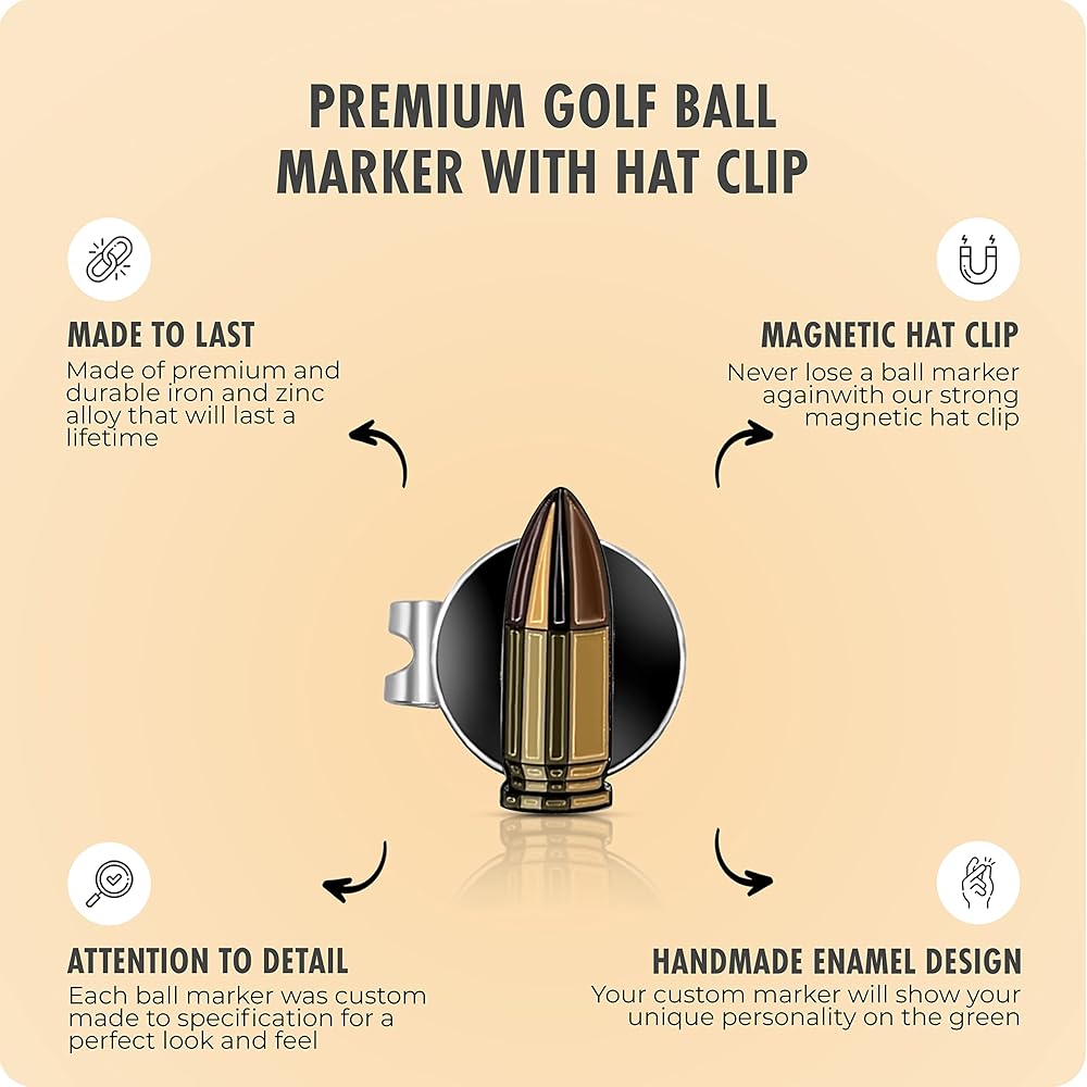 The lucky golf ball marker is custom designed to offer premium performance and catch all your friend's or adversaries' attention. Made of iron and zinc alloy, materials that are not only resilient but also durable and reliable, the bullet enamel golf ball marker comes with a magnetic hat clip for extra convenience and easy carrying. Ideal for personalizing your golf game and boosting your confidence, our golf ball marker is a must-have for any golf enthusiast.
