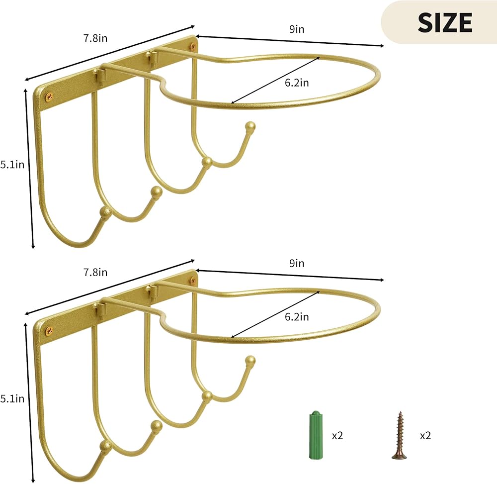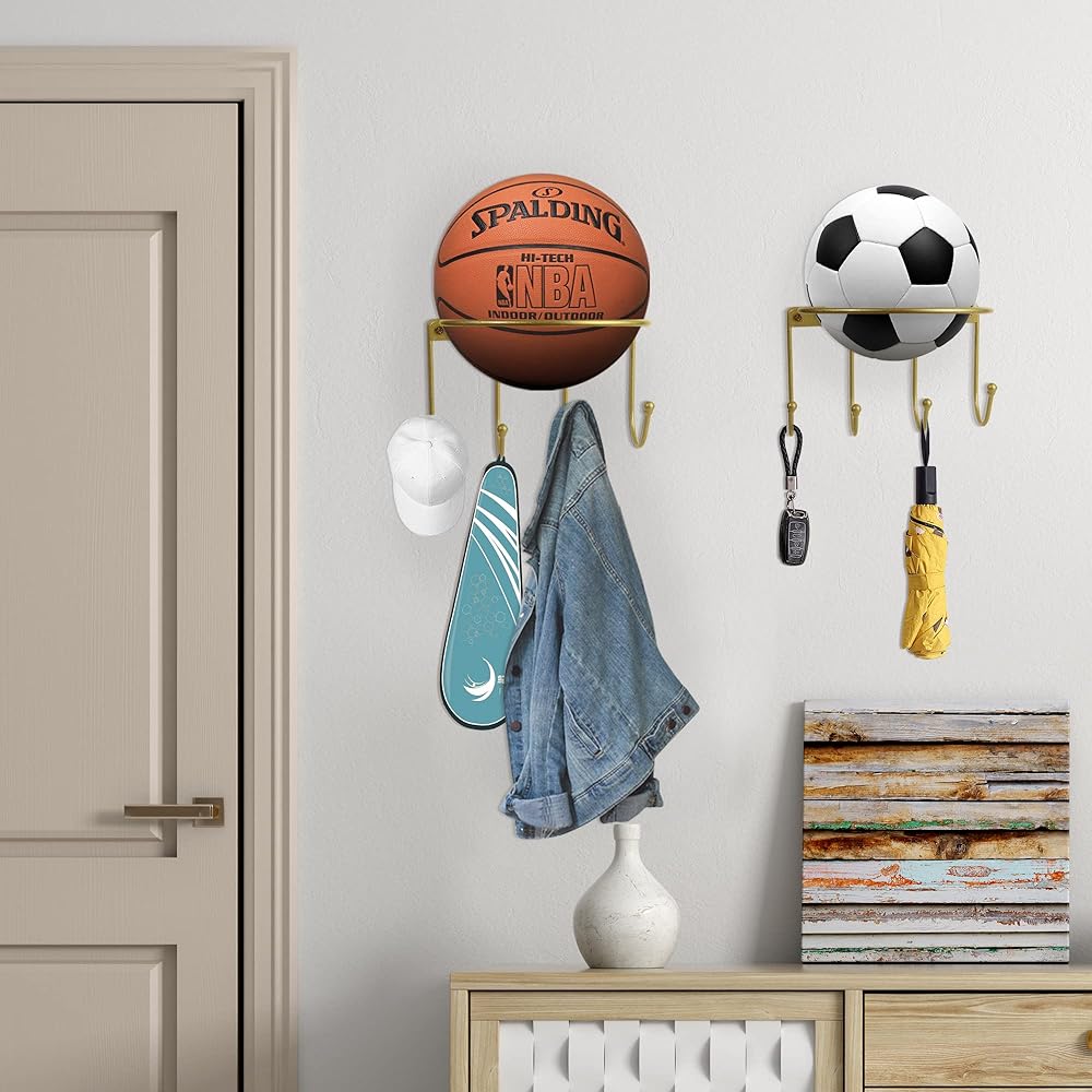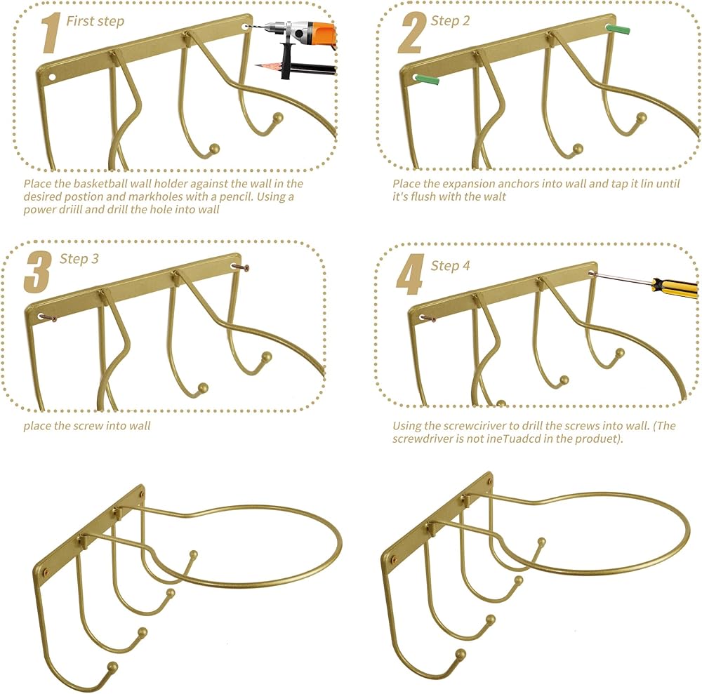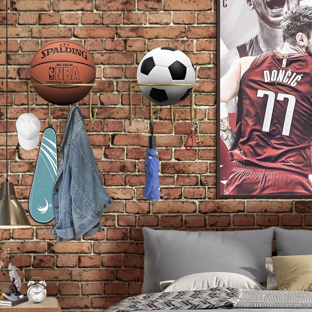قطعتان من حامل الكرة الذهبي العالمي المثبت على الحائط، حامل عرض تخزين الكرة المعدنية مع 4 خطاف، حامل حامل الكرة لكرة السلة وكرة القدم وكرة القدم الطائرة